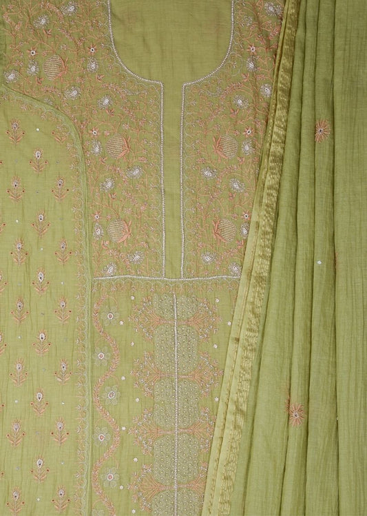 Firgun Mehendi Green Lucknowi Chikankari & Pearl Work Mul Chanderi Unstitched Kurta & Dupatta Set