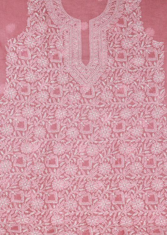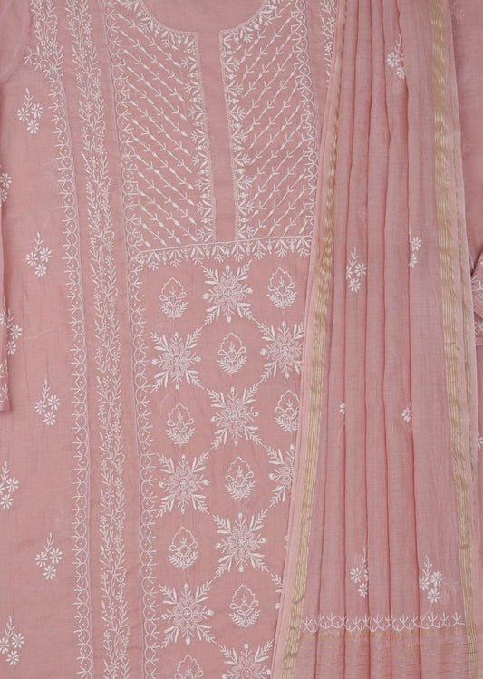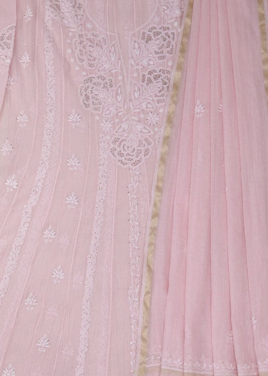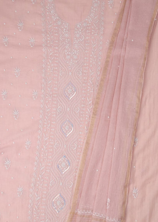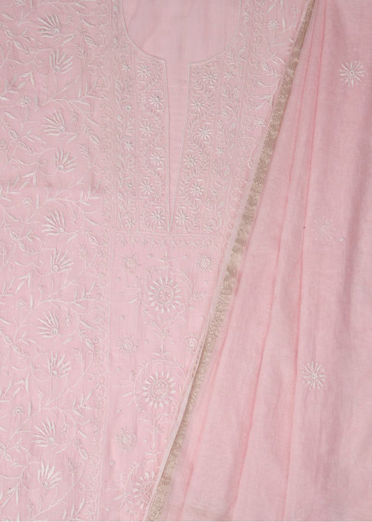 Firgun Baby Pink Lucknowi Chikankari & Pearl Work Mul Chanderi Unstitched Kurta & Dupatta Set