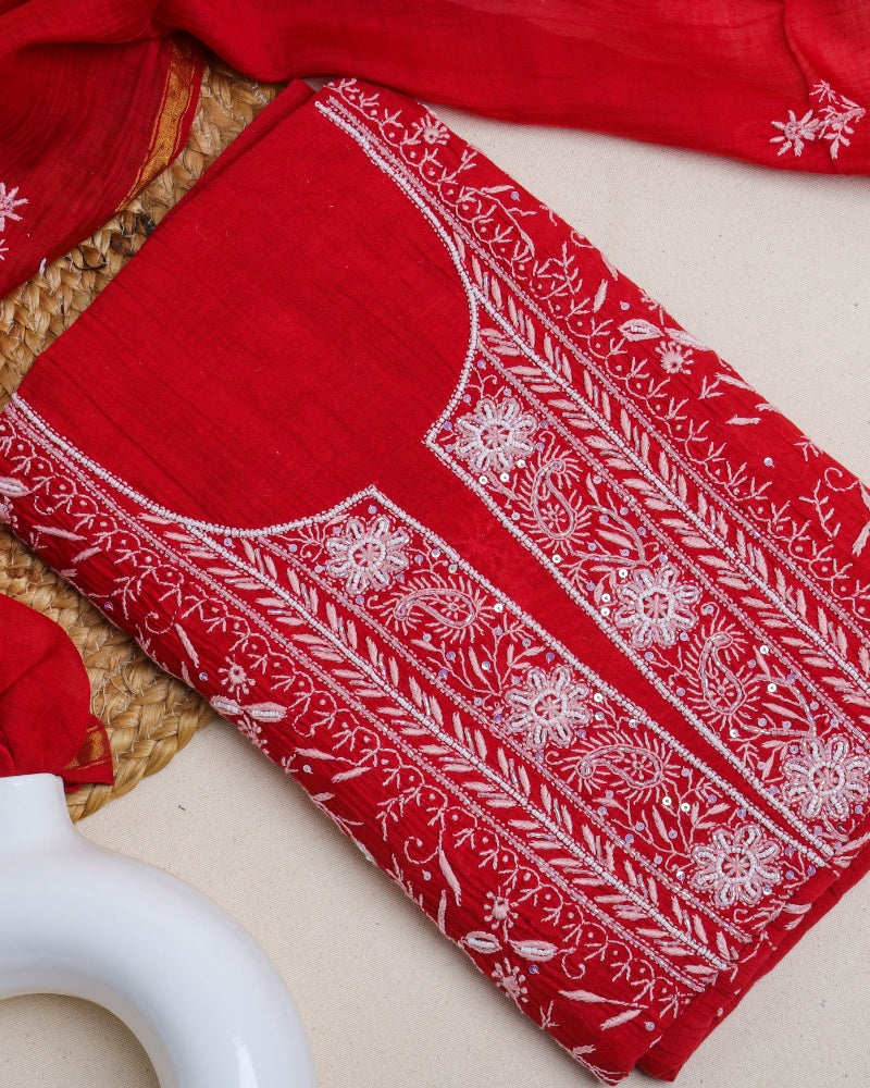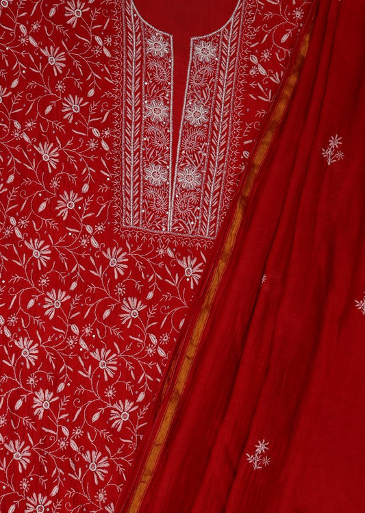 Firgun Red Lucknowi Chikankari Mul Chanderi Unstitched Kurta & Dupatta Set