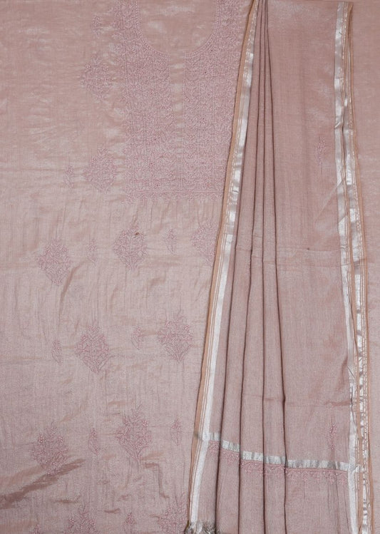 Firgun Silver Lucknowi Chikankari Chanderi Tissue Unstitched Kurta & Dupatta Set