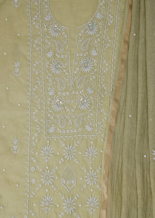 Firgun Mehendi Green Lucknowi Chikankari Mul Chanderi Unstitched Kurta & Dupatta Set