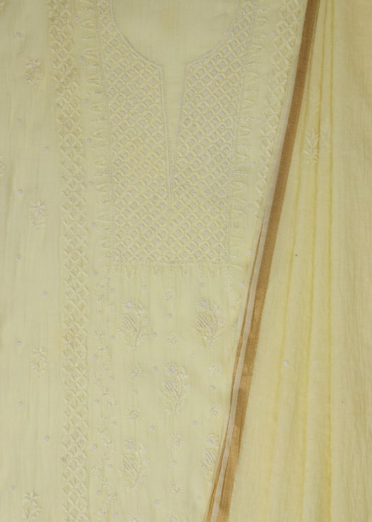 Firgun Lemon Lucknowi Chikankari & Pearl Work Mul Chanderi Unstitched Kurta & Dupatta Set