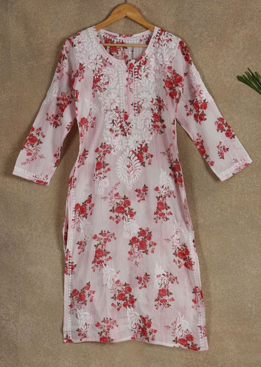 Firgun White Pink Printed Lucknowi Chikankari Cotton Kurta