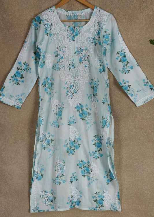 Firgun White Blue Printed Lucknowi Chikankari Cotton Kurta