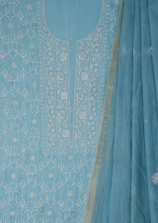 Firgun Cerulean Blue Lucknowi Chikankari Mul Chanderi Unstitched Kurta & Dupatta Set