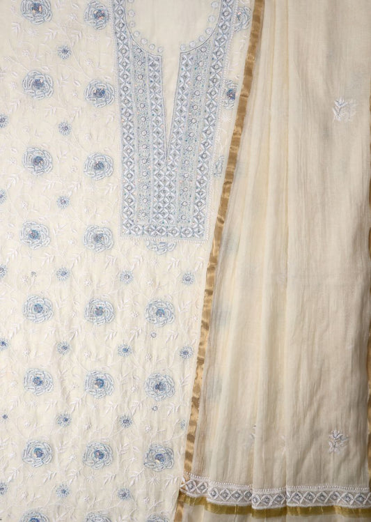 Firgun White & Blue Lucknowi Chikankari Mul Chanderi Unstitched Kurta & Dupatta Set
