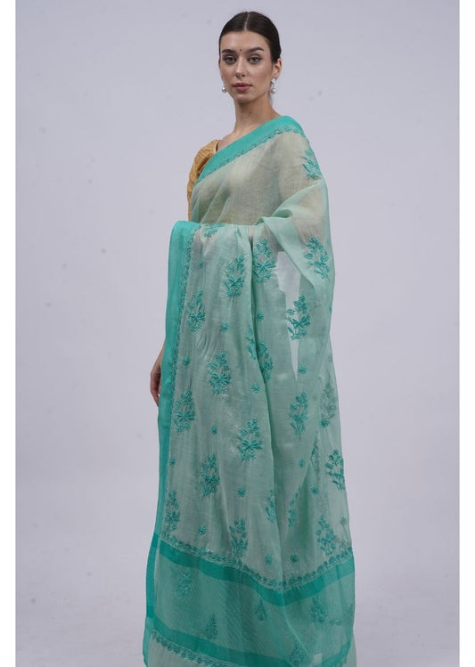 Firgun Green Lucknowi Chikankari Organza Tissue Saree with Unstitched Blouse Piece