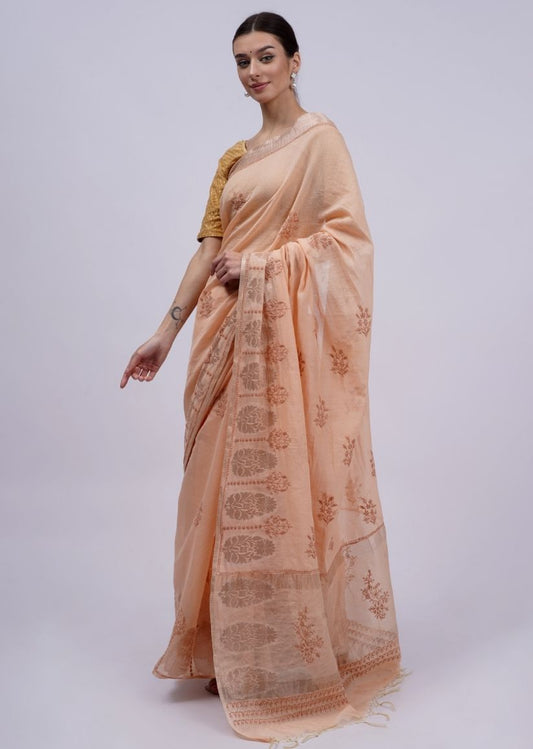 Firgun Peach Lucknowi Chikankari Chanderi Tissue Saree with Unstitched Blouse Piece