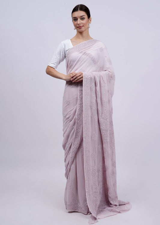 Firgun Lavender Lucknowi Chikankari Viscose Georgette Saree with Unstitched Blouse Piece