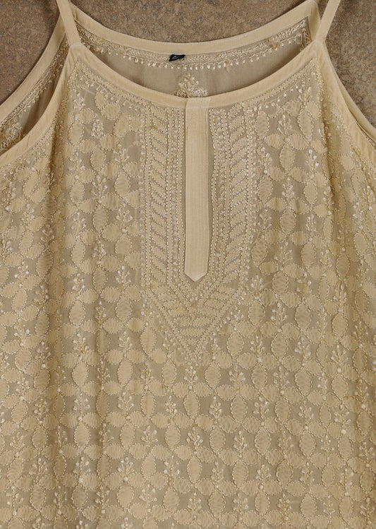 Firgun Beige Lucknowi Chikankari Viscose Georgette Spaghetti Top