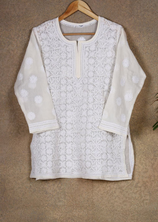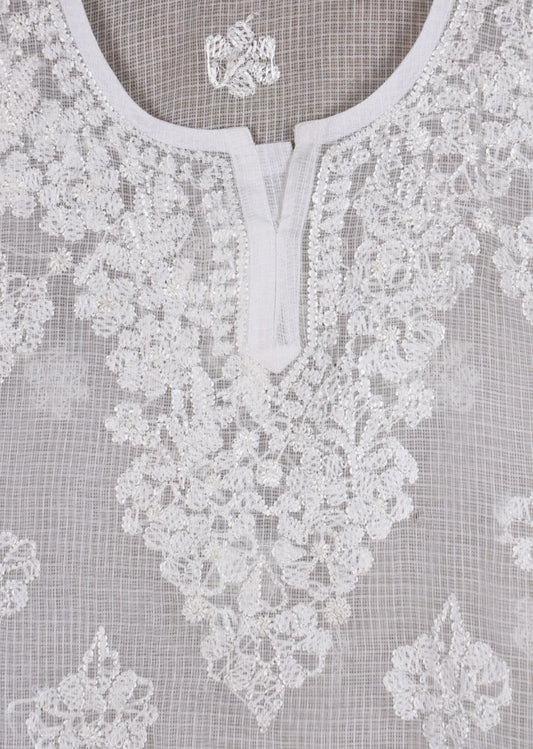 Firgun White Lucknowi Chikankari Kota Cotton Top