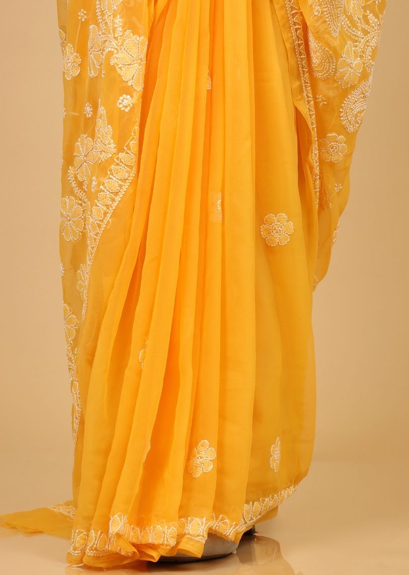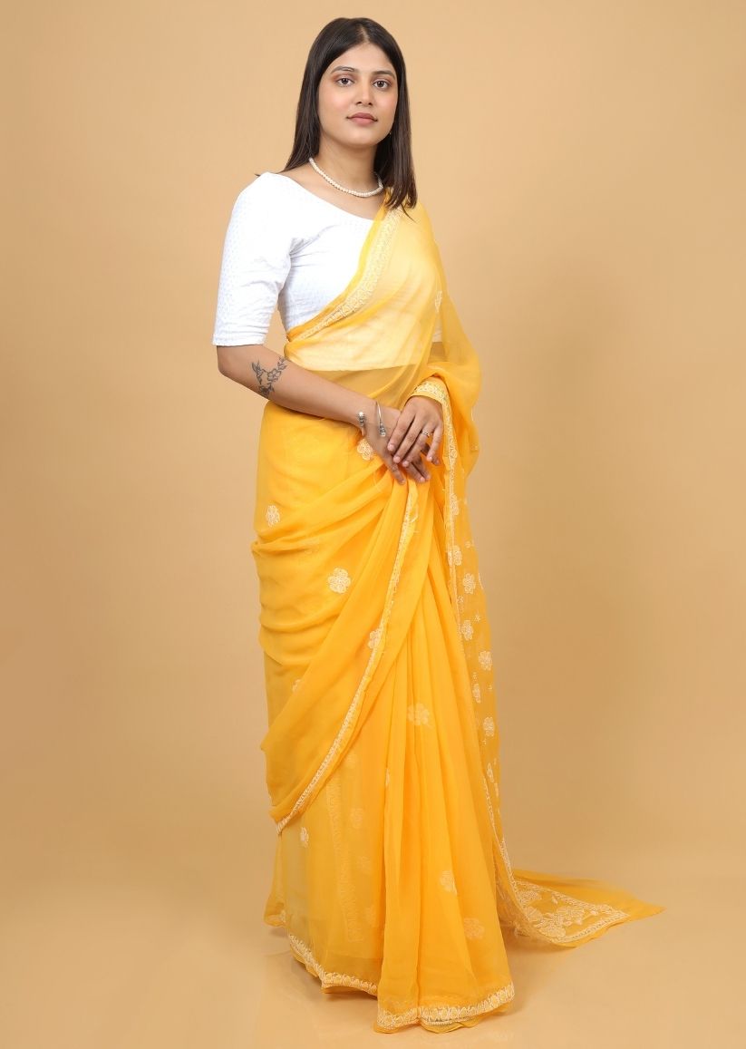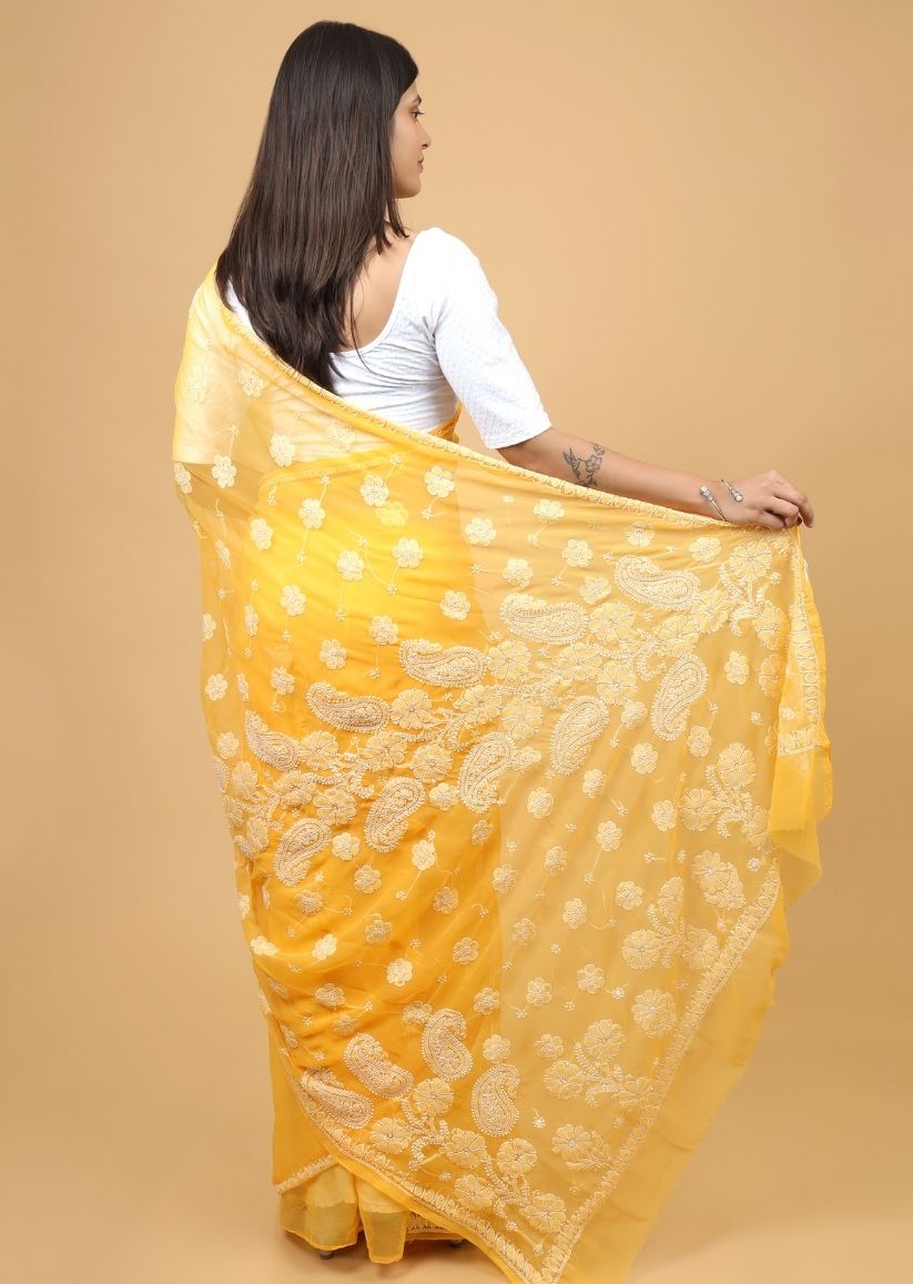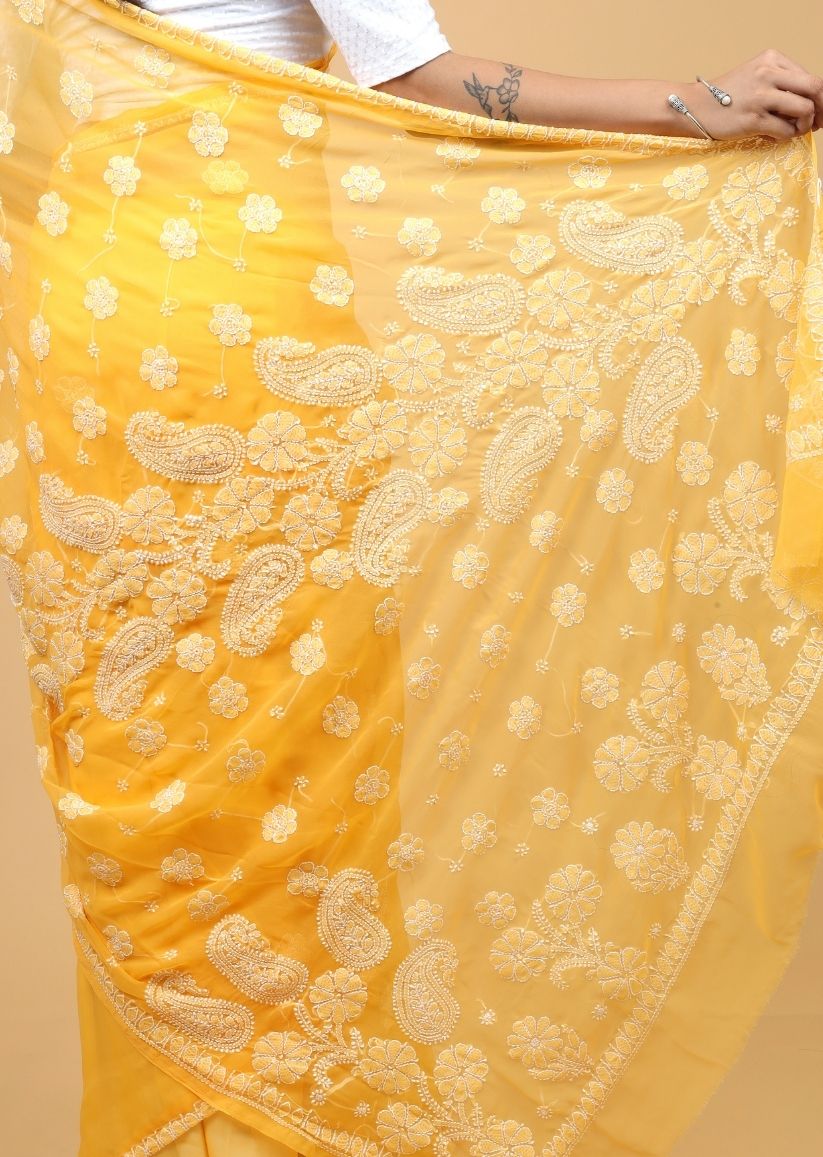 Firgun Amber Yellow Lucknowi Chikankari Georgette Saree