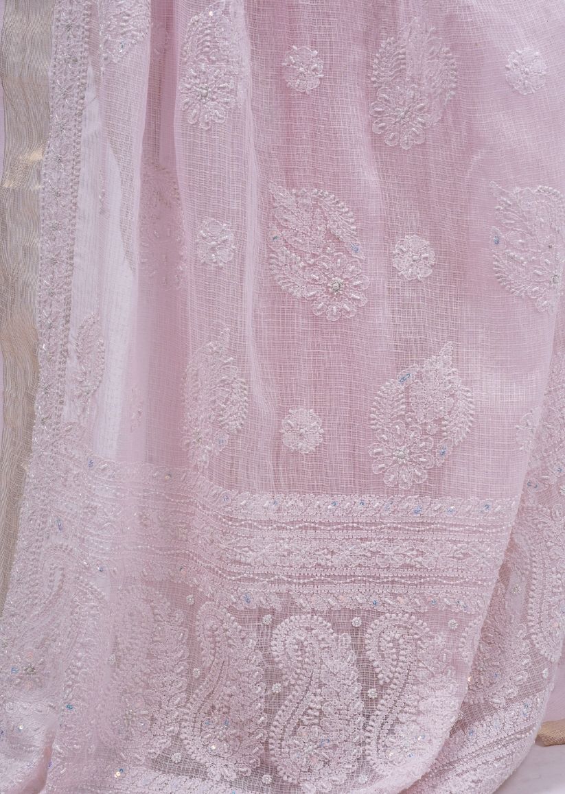Firgun Baby Pink Lucknowi Chikankari Kota Doria Saree with Unstitched Blouse Piece