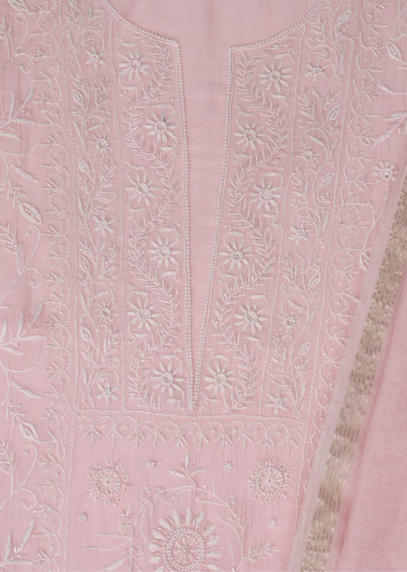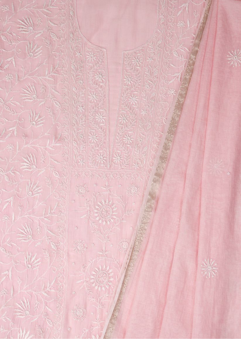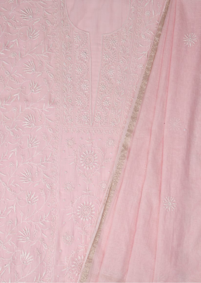 Firgun Baby Pink Lucknowi Chikankari & Pearl Work Mul Chanderi Unstitched Kurta & Dupatta Set