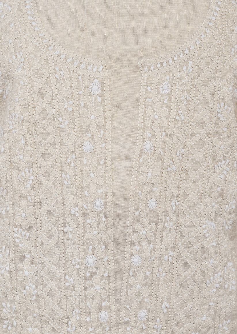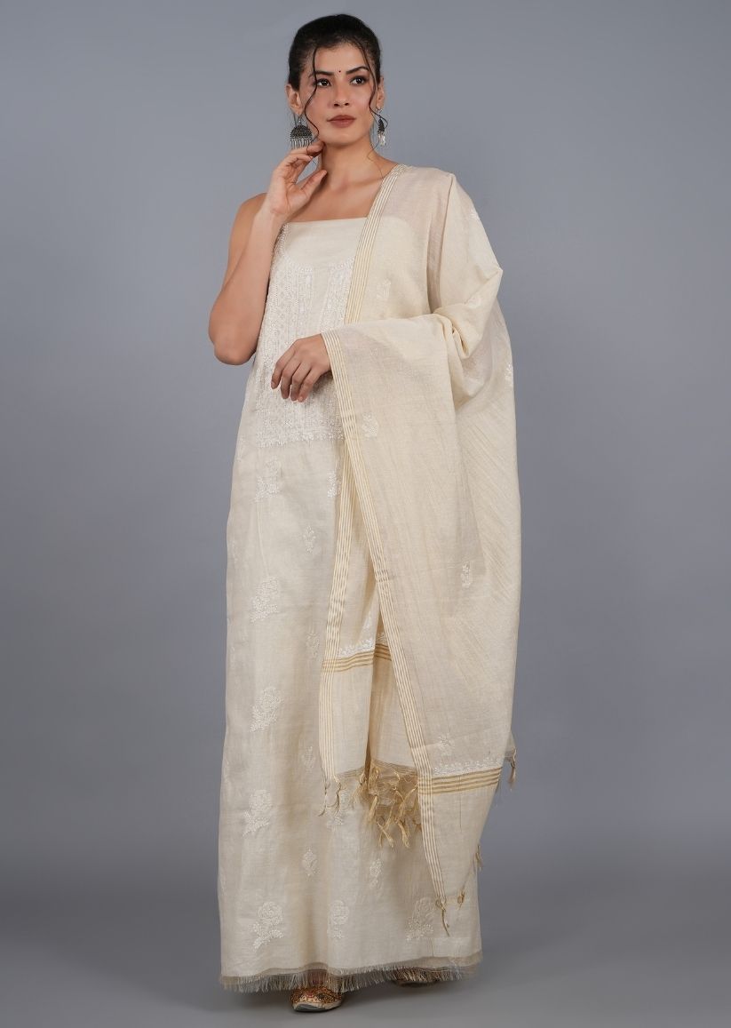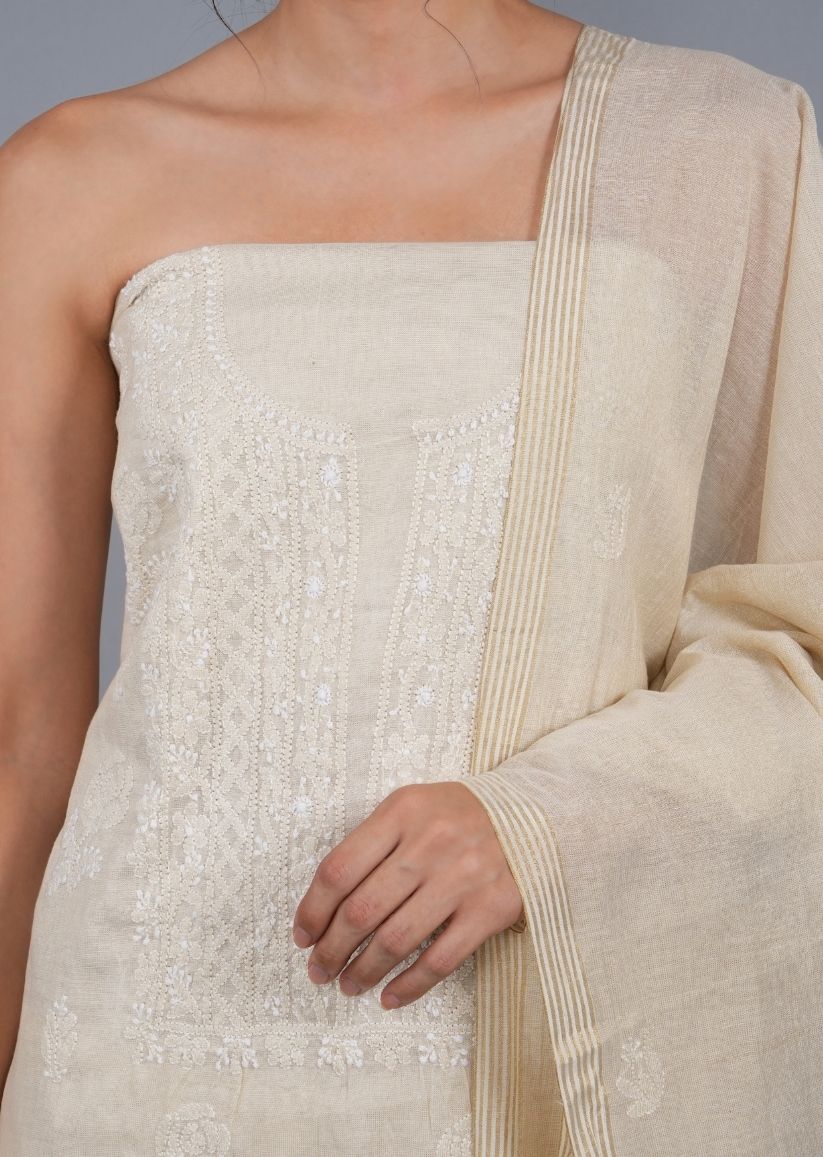 Firgun Beige Lucknowi Chikankari Tissue Chanderi Unstitched Kurta & Dupatta Set