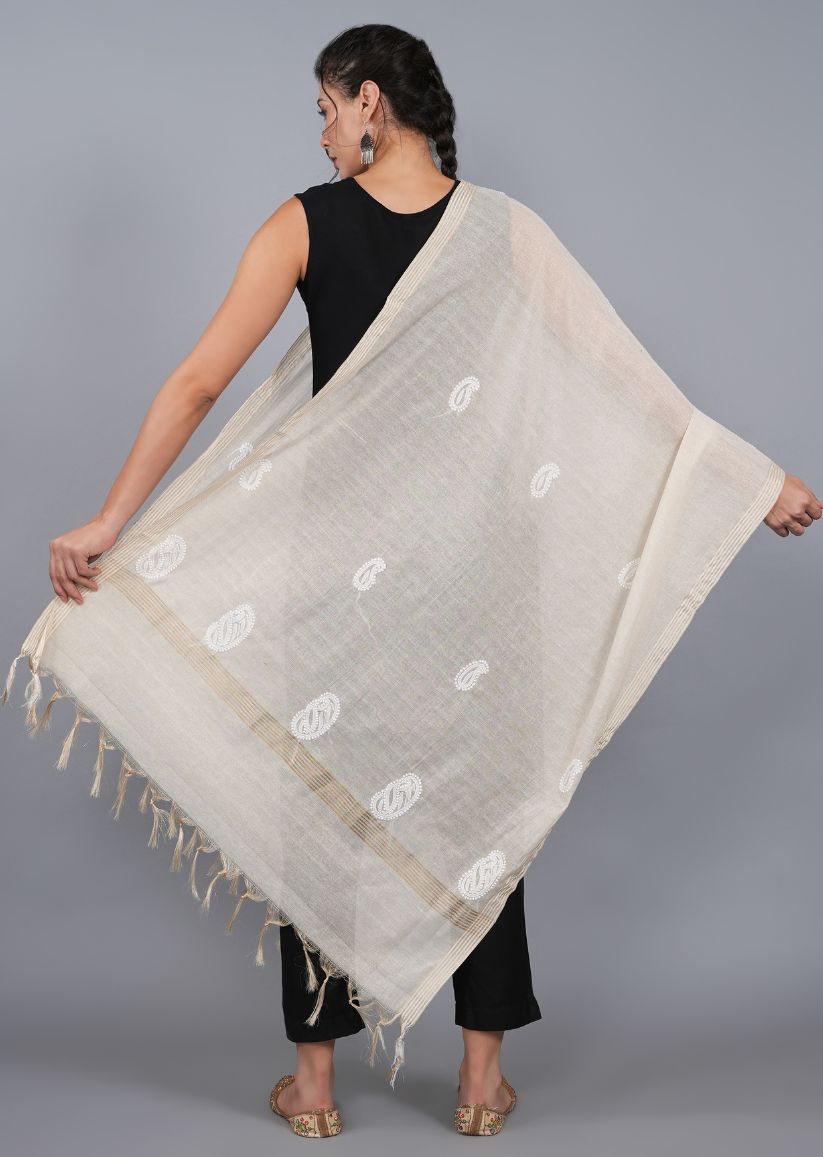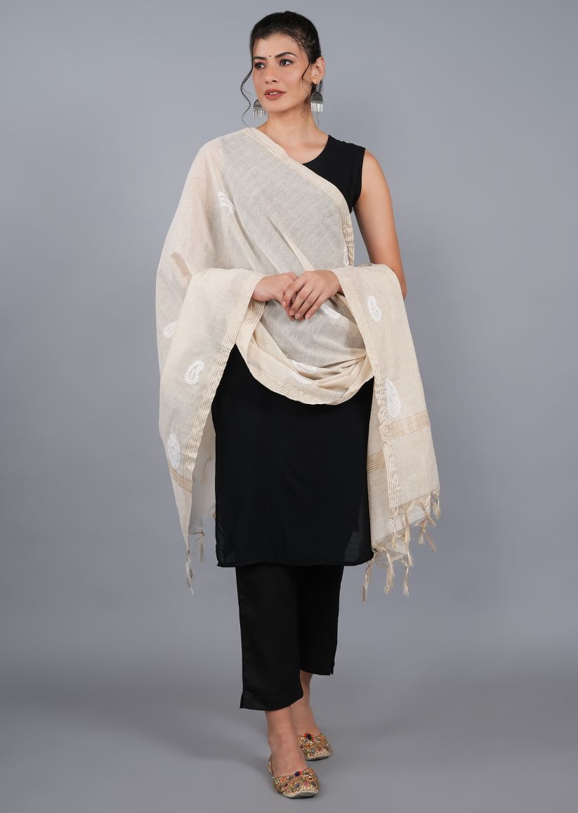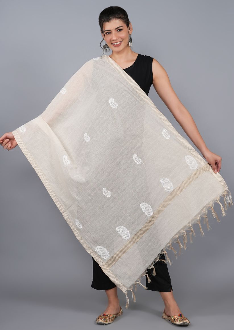An easy-to-style dupatta crafted on beige tissue chanderi fabric with scattered chikankari butis. Featuring delicate bakhiya and phanda stitches, this dupatta is versatile and can be paired with a variety of outfits. Its dyeable fabric makes it even more adaptable to your wardrobe needs. A practical bestseller, perfect for everyday wear or casual occasions.