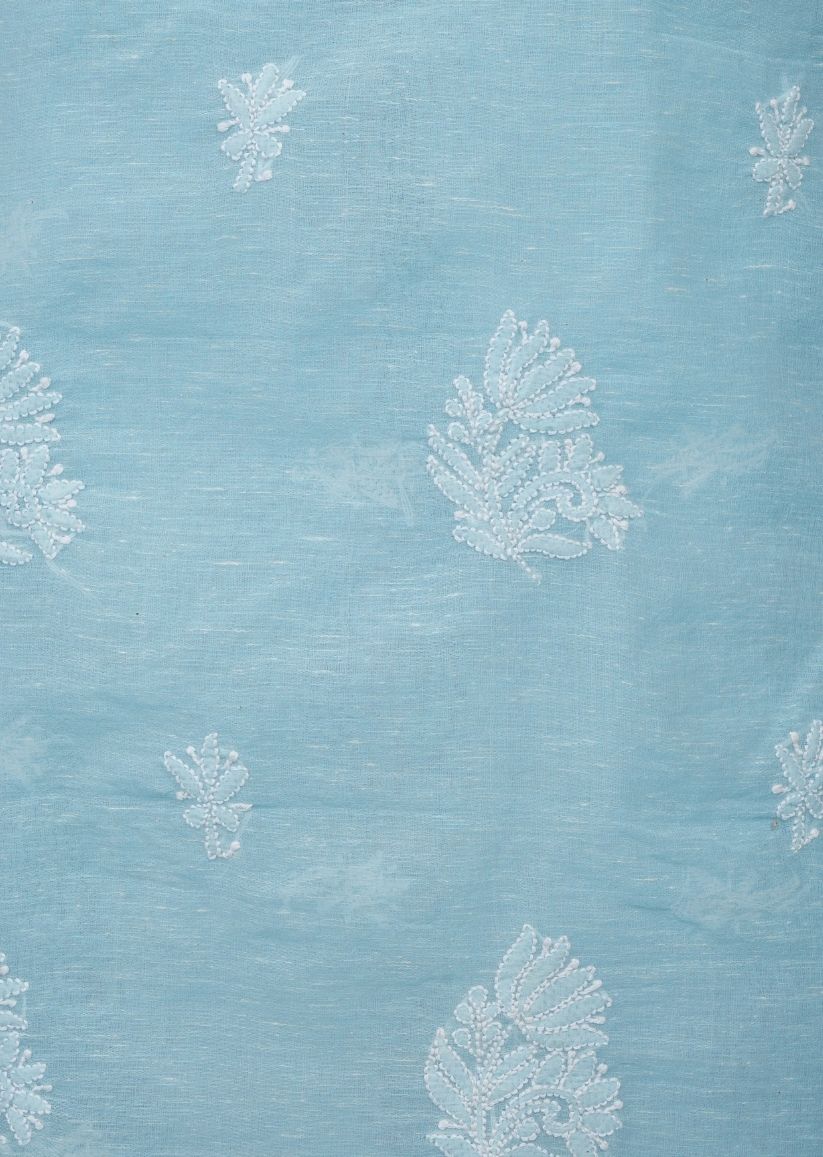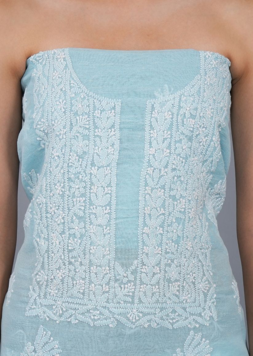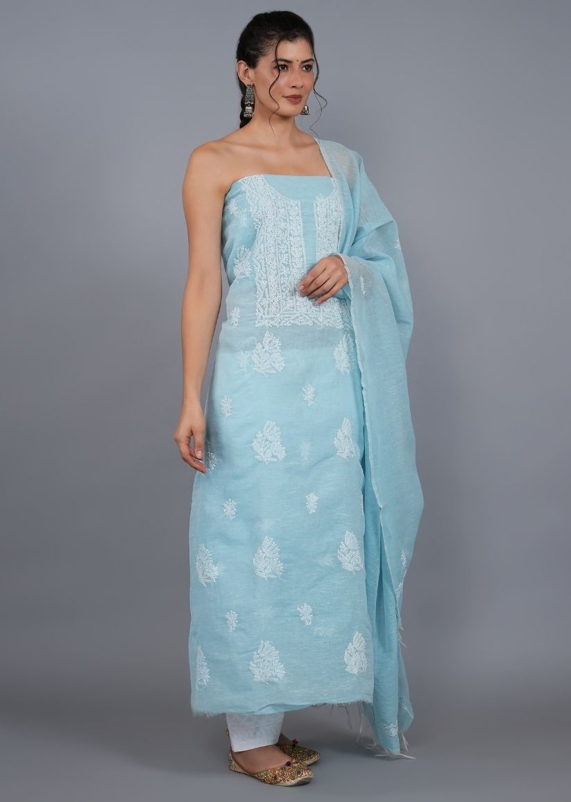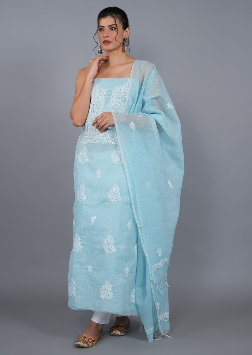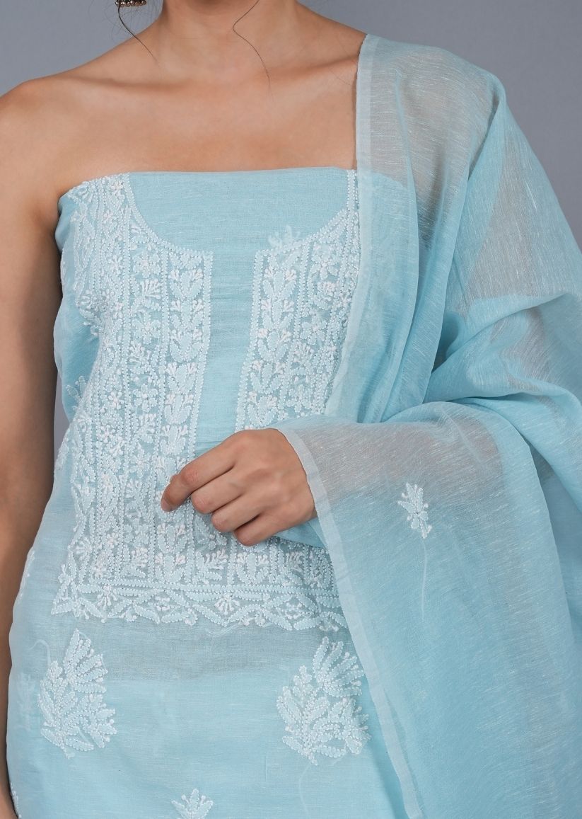 Bright, airy, and effortlessly elegant, this blue unstitched Lucknowi chikankari kurta-dupatta set is crafted in breathable linen fabric, perfect for comfort and style in warm weather.