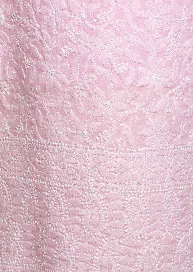 A classic bestseller in soft pink voile cotton, showcasing the timeless elegance of chikankari. The kurta features full jaal embroidery in the front, a statement buta at the back, and scattered butis all over.