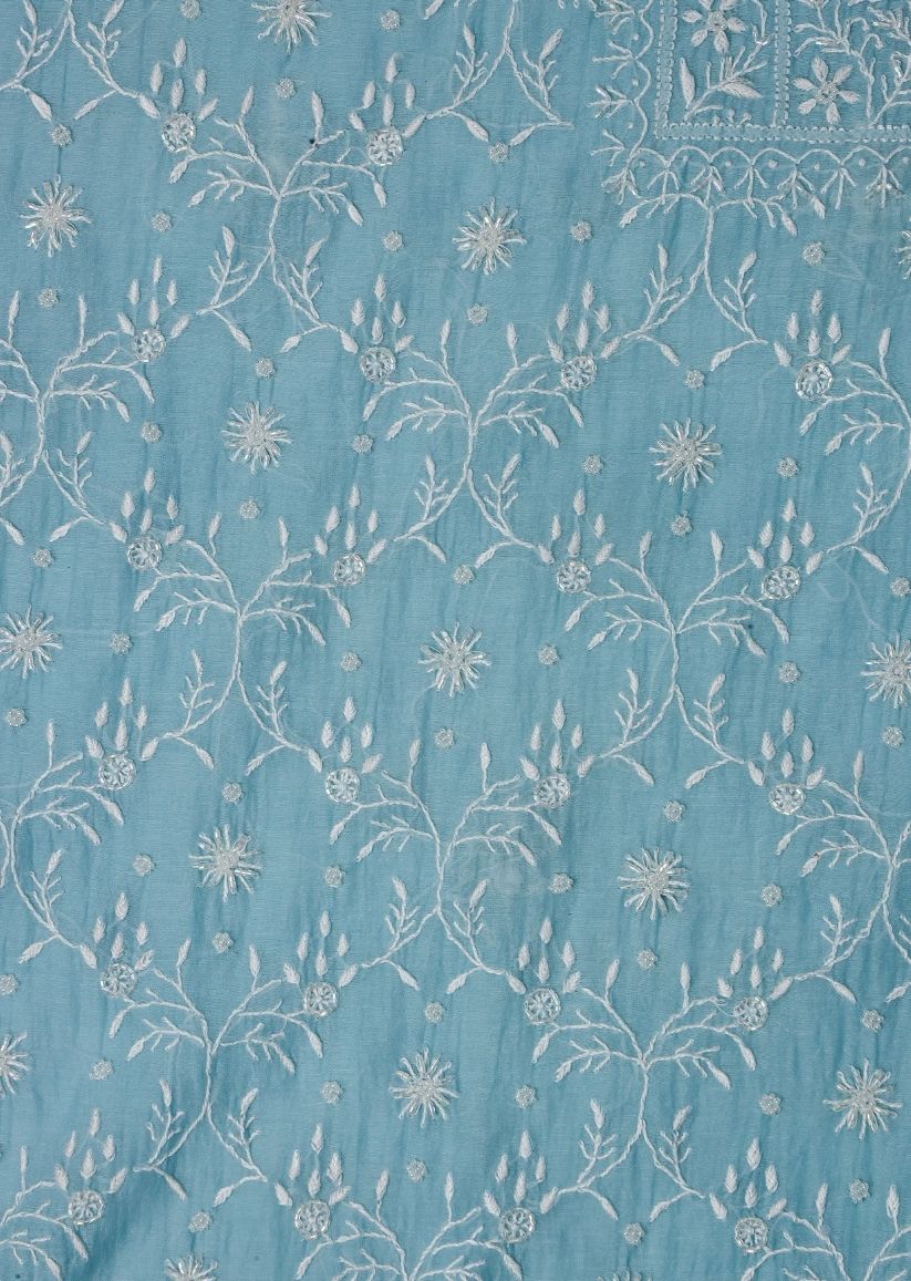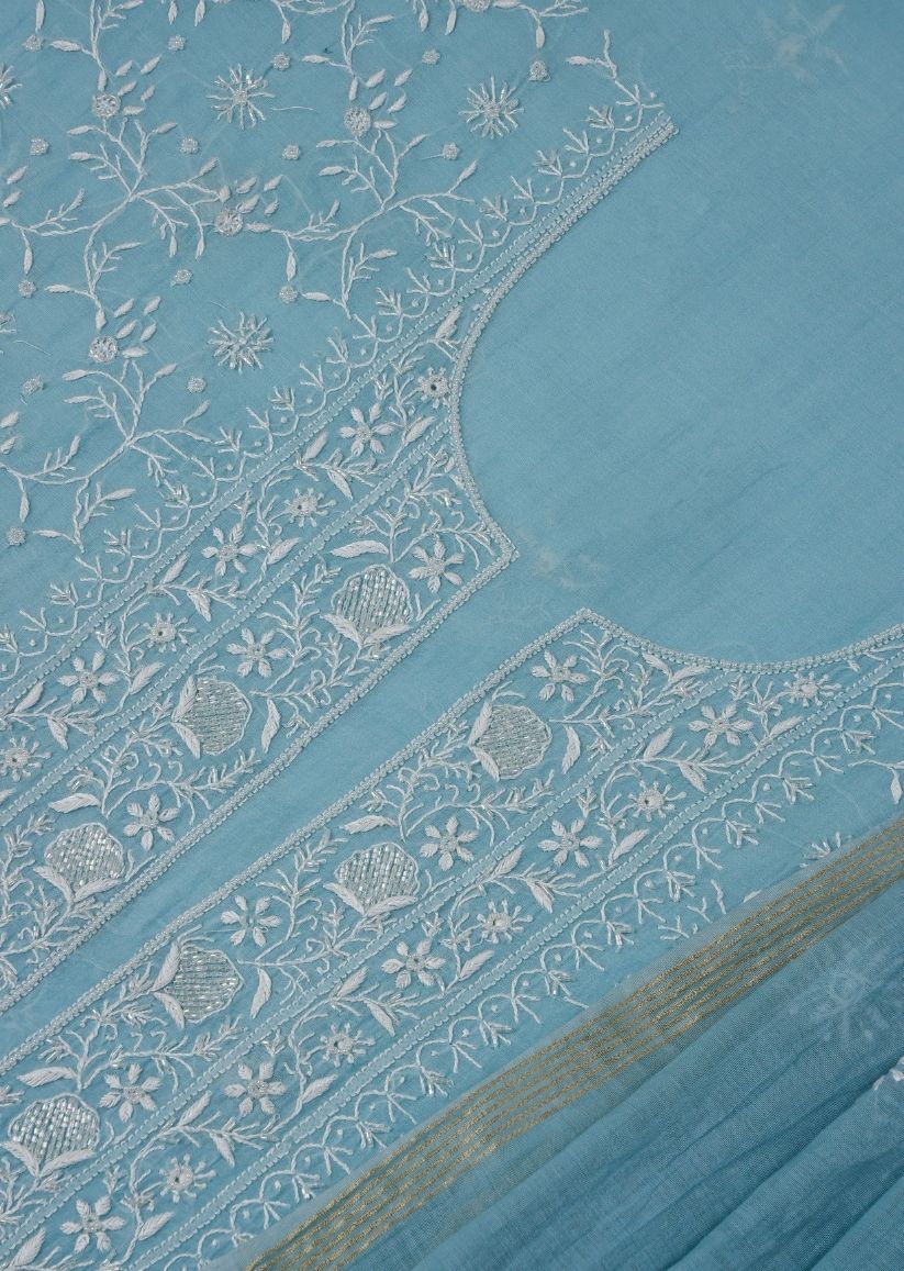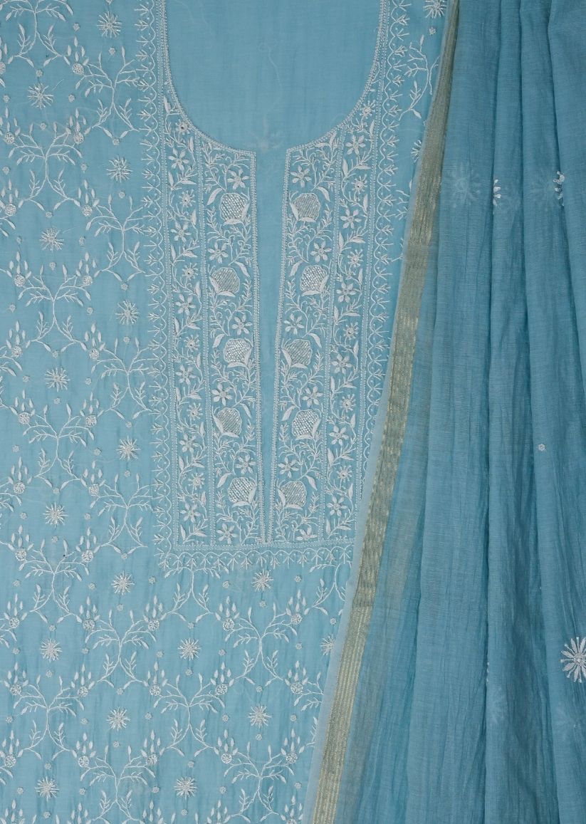 Firgun Cerulean Blue Lucknowi Chikankari Mul Chanderi Unstitched Kurta & Dupatta Set