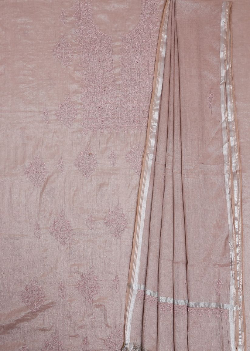 Firgun Cola Lucknowi Chikankari Chanderi Silver Tissue Unstitched Kurta & Dupatta Set