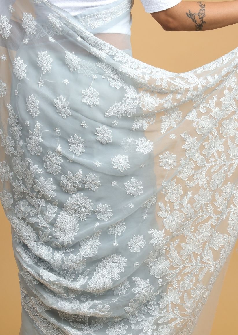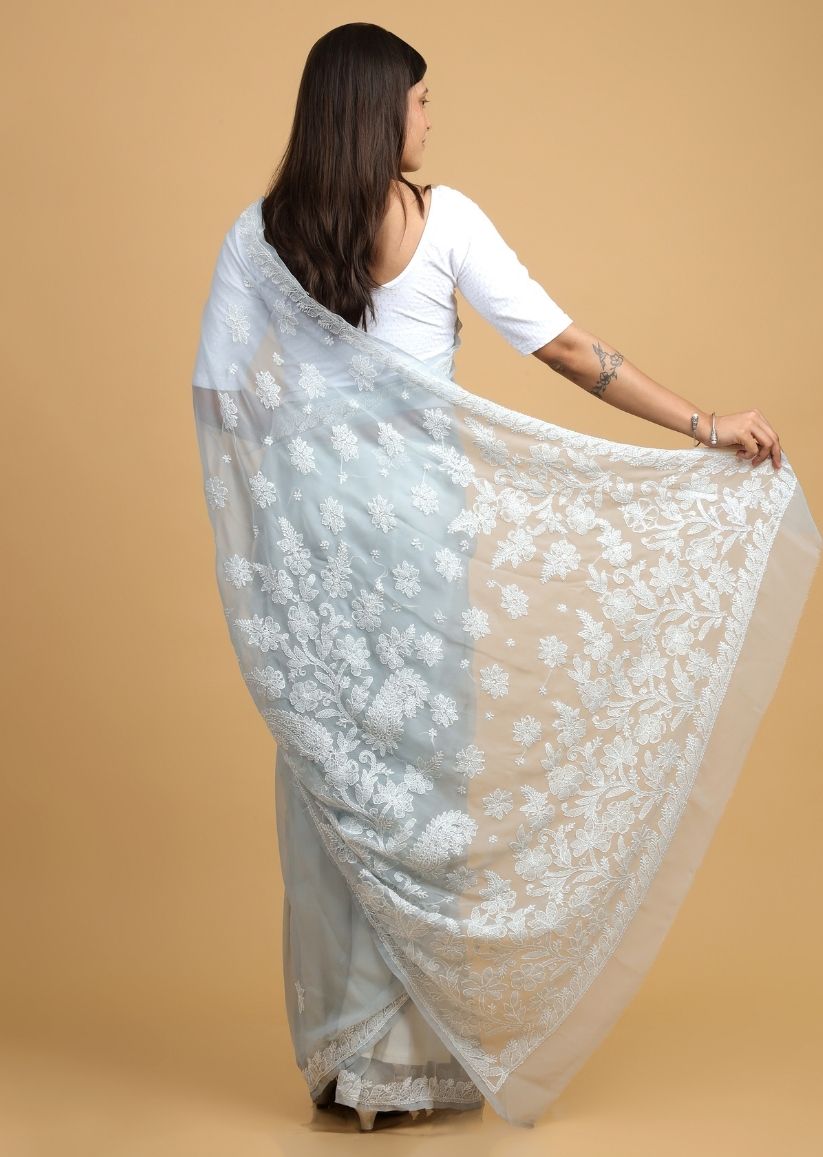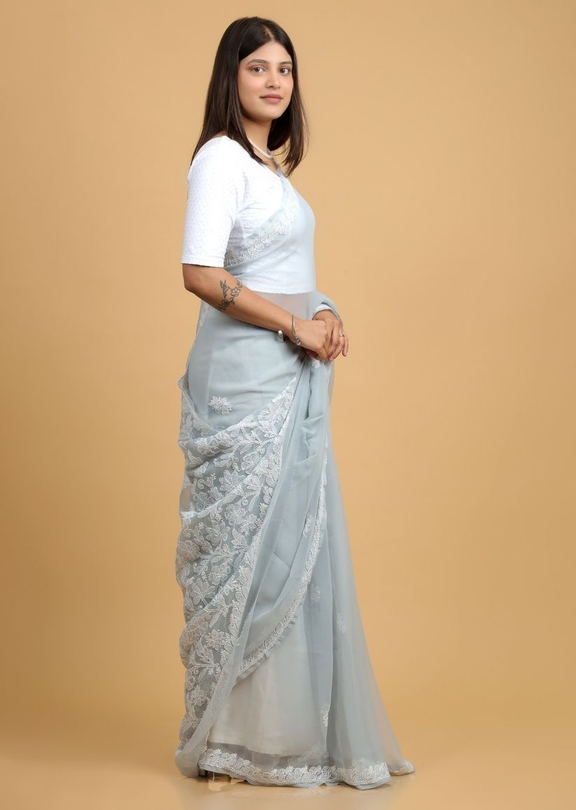 Firgun Grey Lucknowi Chikankari Georgette Saree with Unstitched Blouse Piece