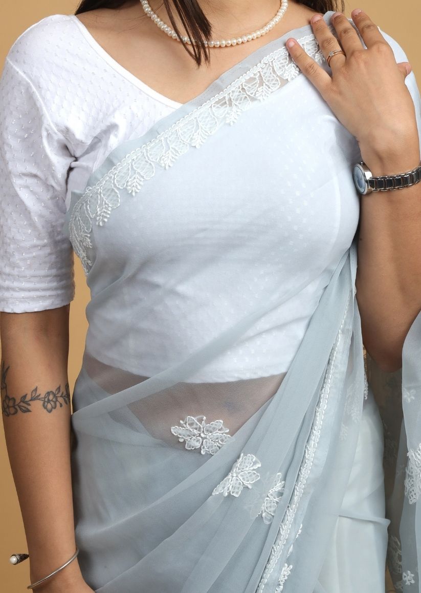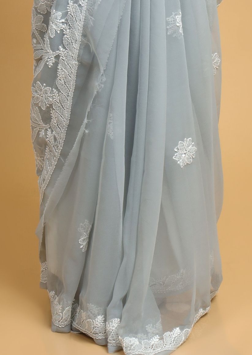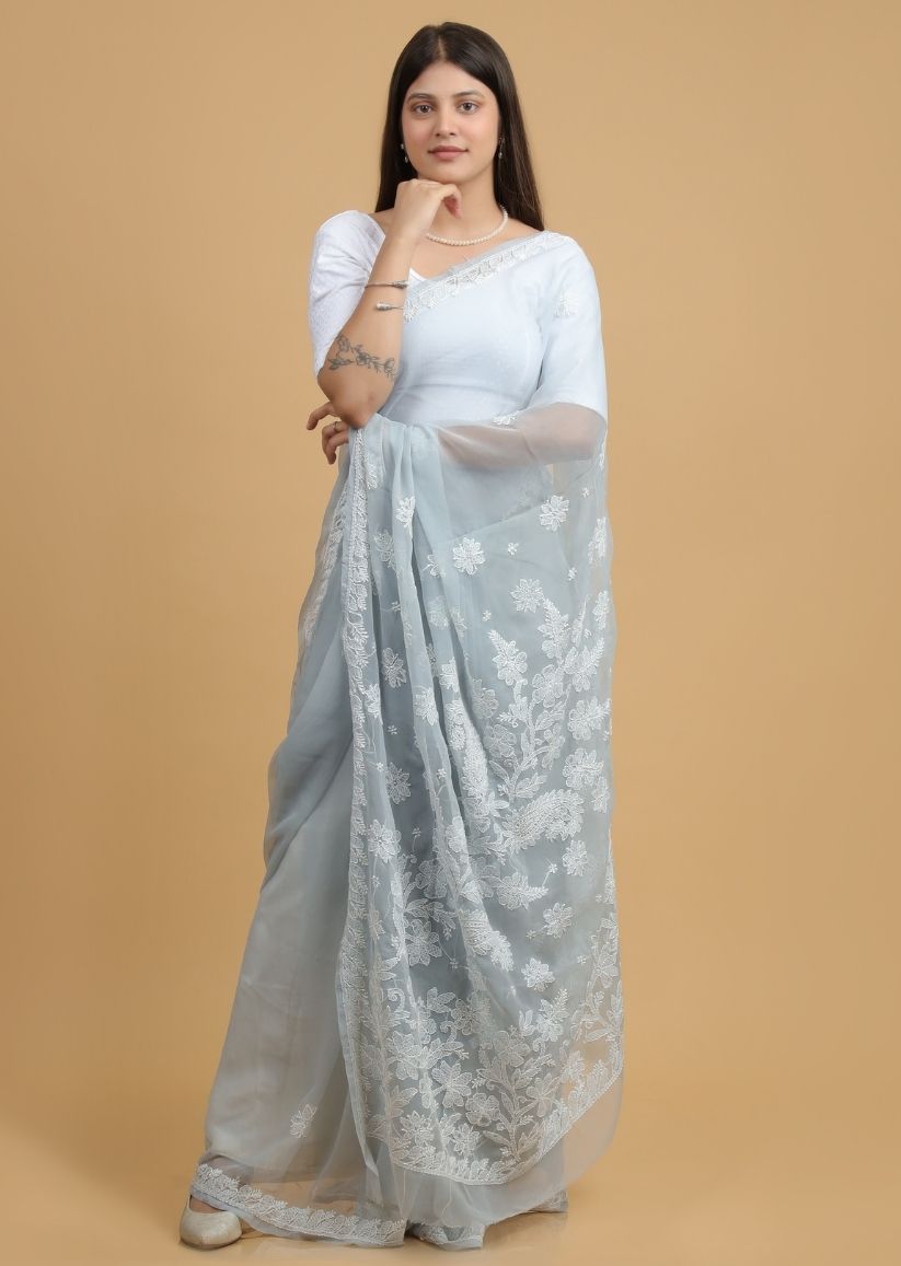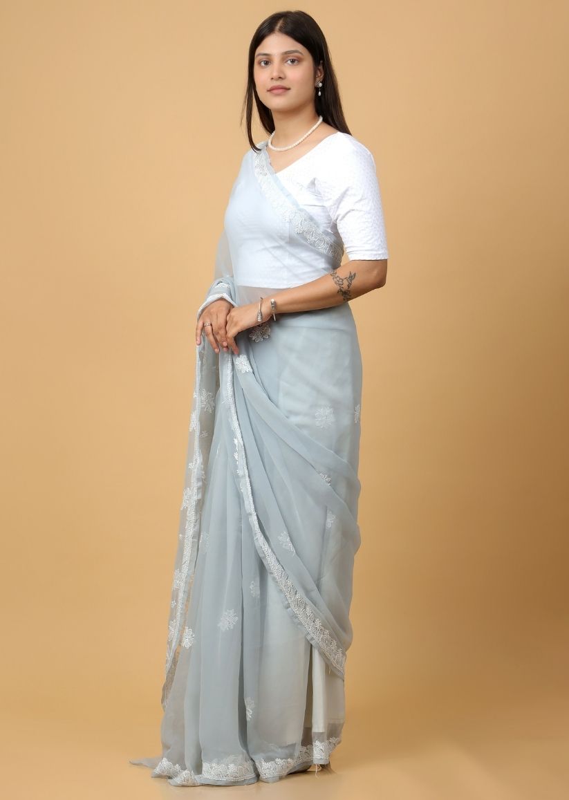 Firgun Grey Lucknowi Chikankari Georgette Saree with Unstitched Blouse Piece
