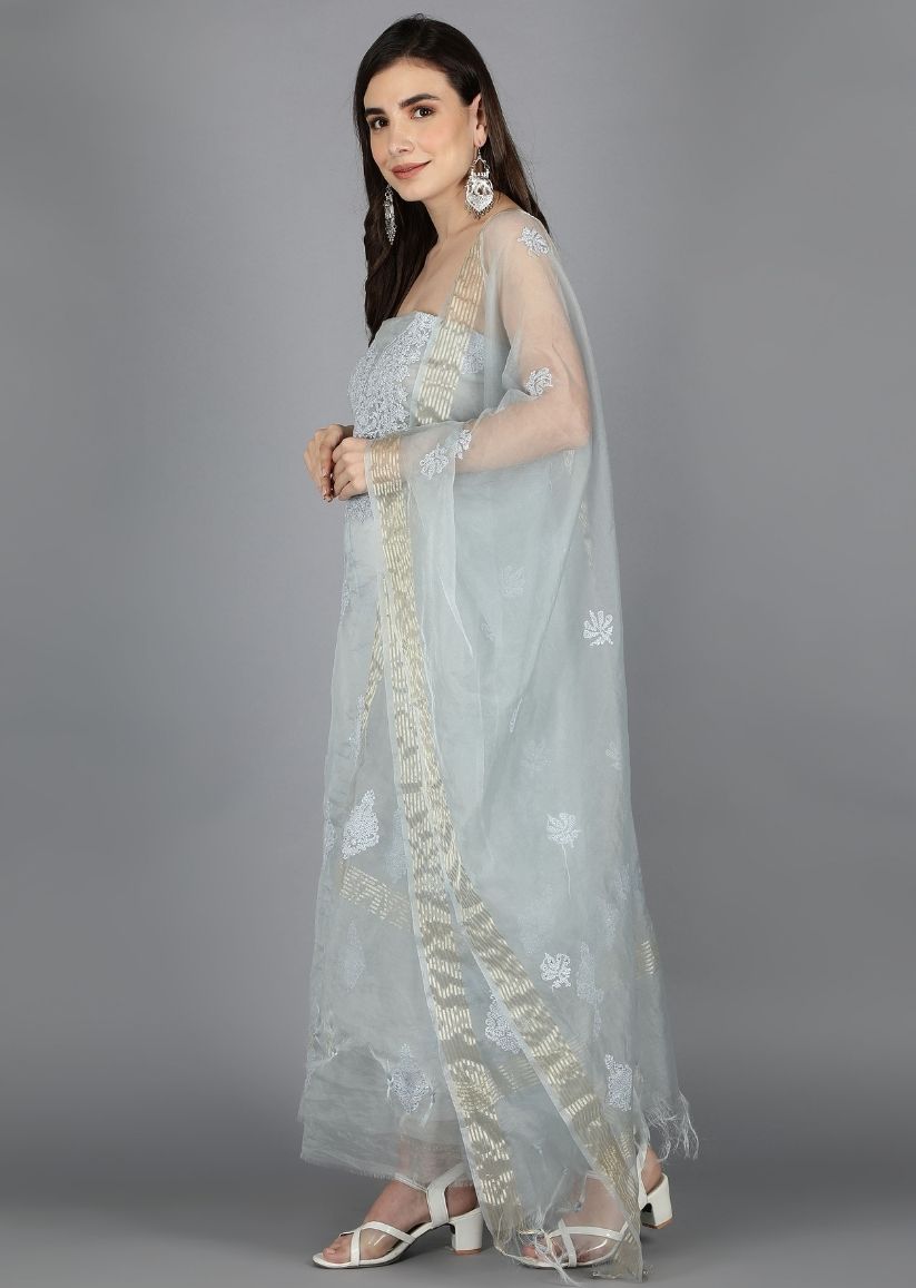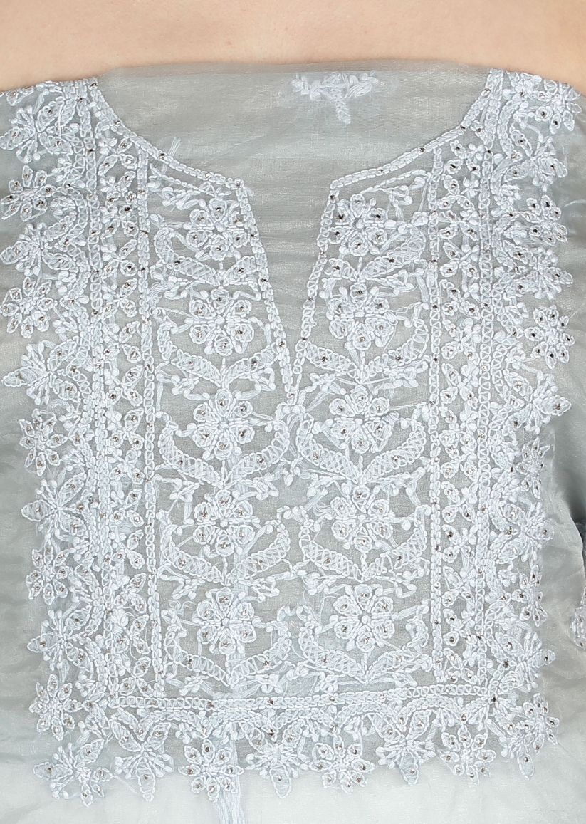 Firgun Grey Lucknowi Chikankari Organza Unstitched Kurta & Dupatta Set