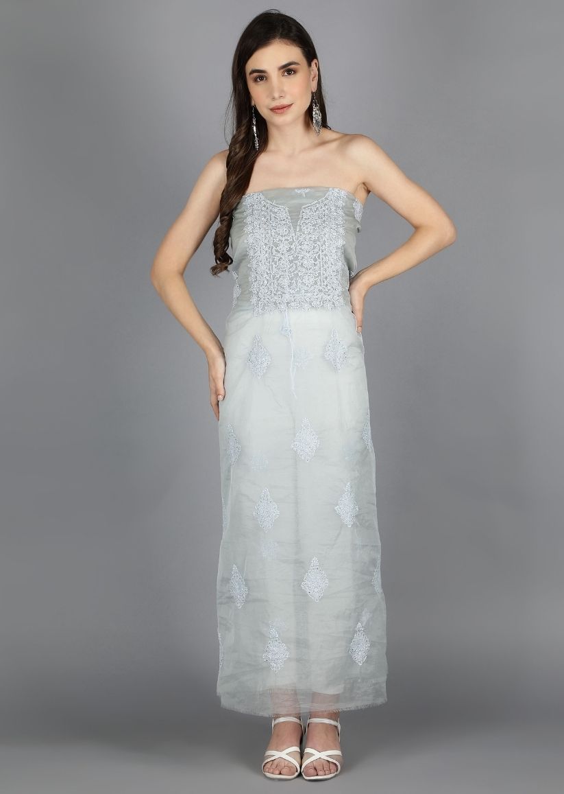 Ethereal and contemporary, this grey unstitched Lucknowi chikankari kurta-dupatta set is crafted in lightweight, trending organza fabric, giving it a delicate sheer texture and effortless elegance.