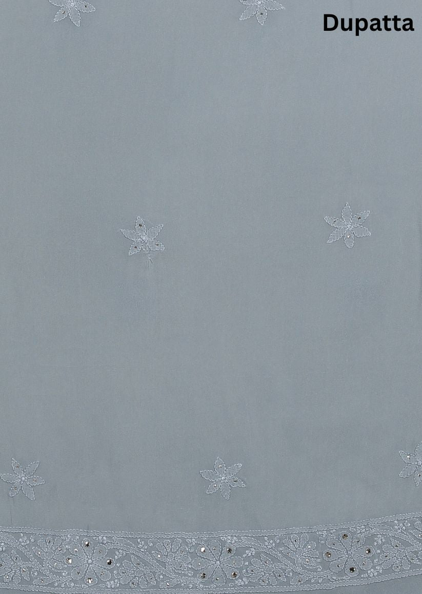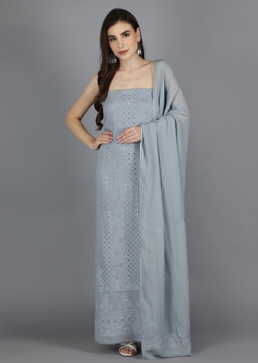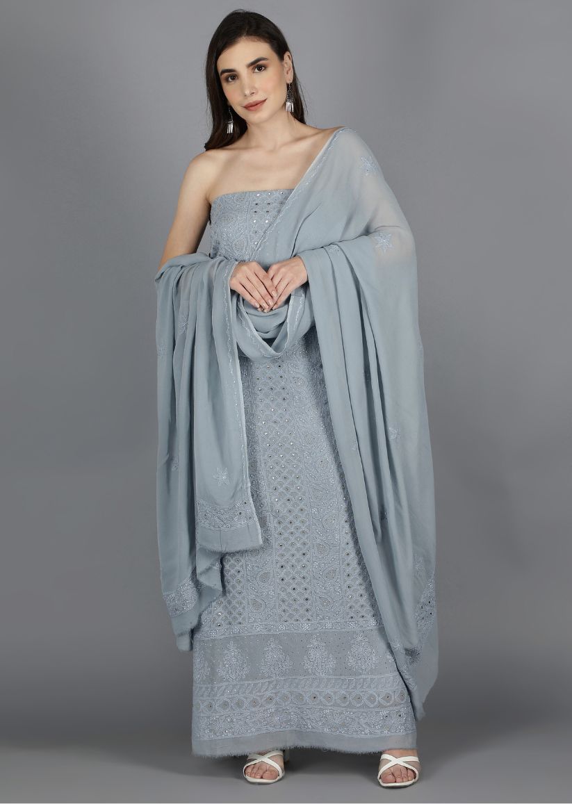 Firgun Grey Lucknowi Chikankari Viscose Georgette Unstitched Kurta & Dupatta Set-1