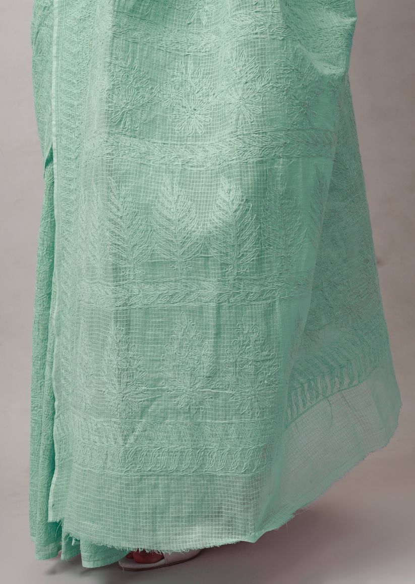 Firgun Hand Embroidered Mint Green Lucknowi Chikankari Kota Doria Tepchi Work Saree with Blouse Piece