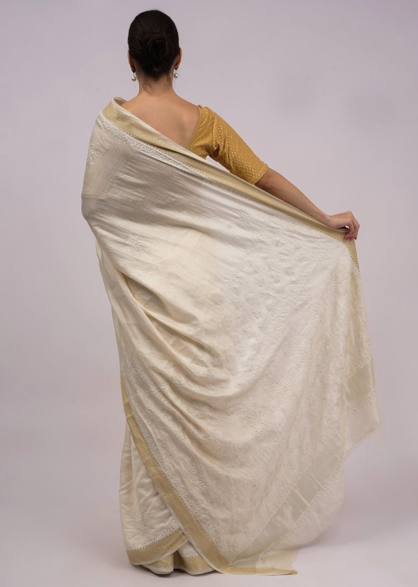 Firgun Ivory Lucknowi Chikankari Silk Saree with Unstitched Blouse Piece