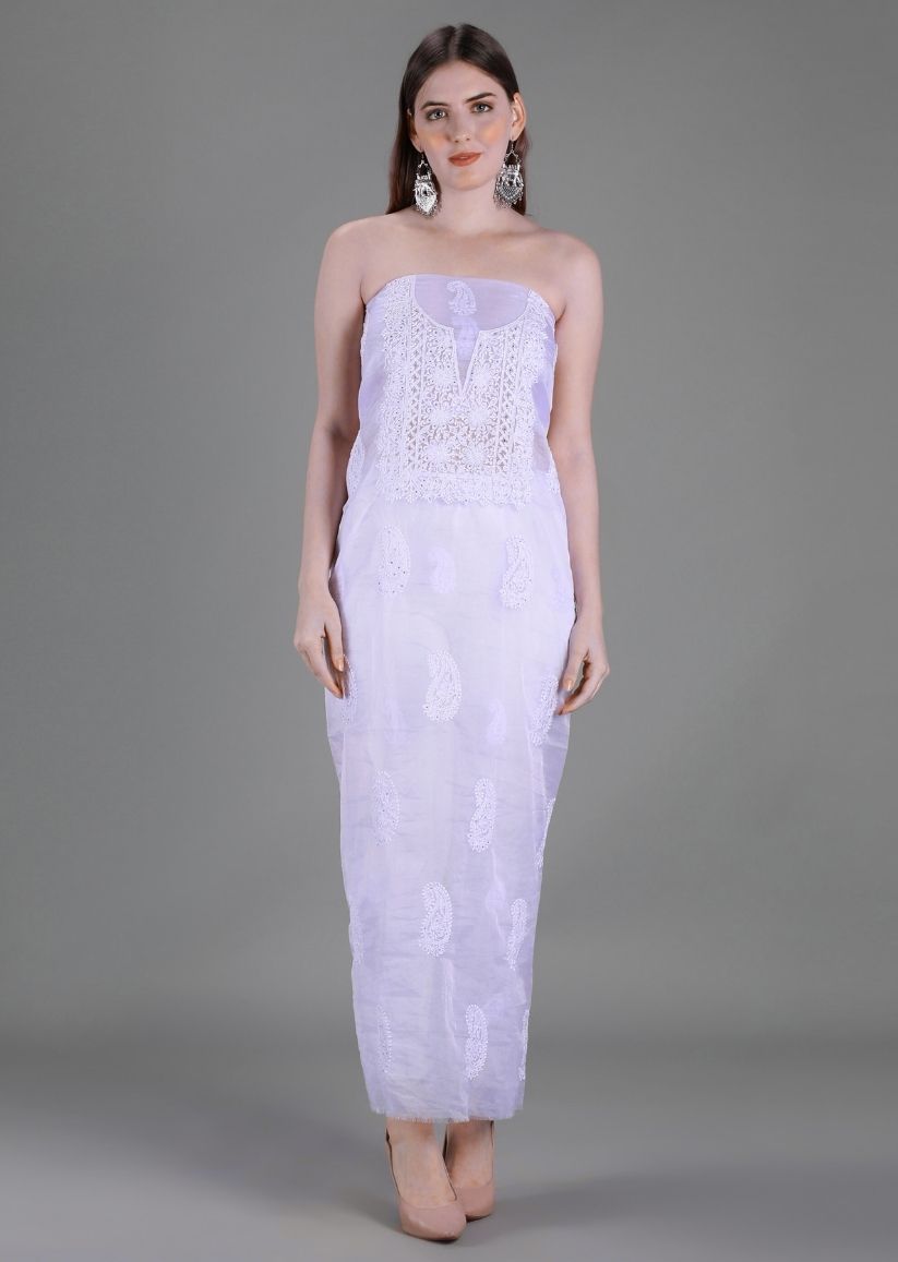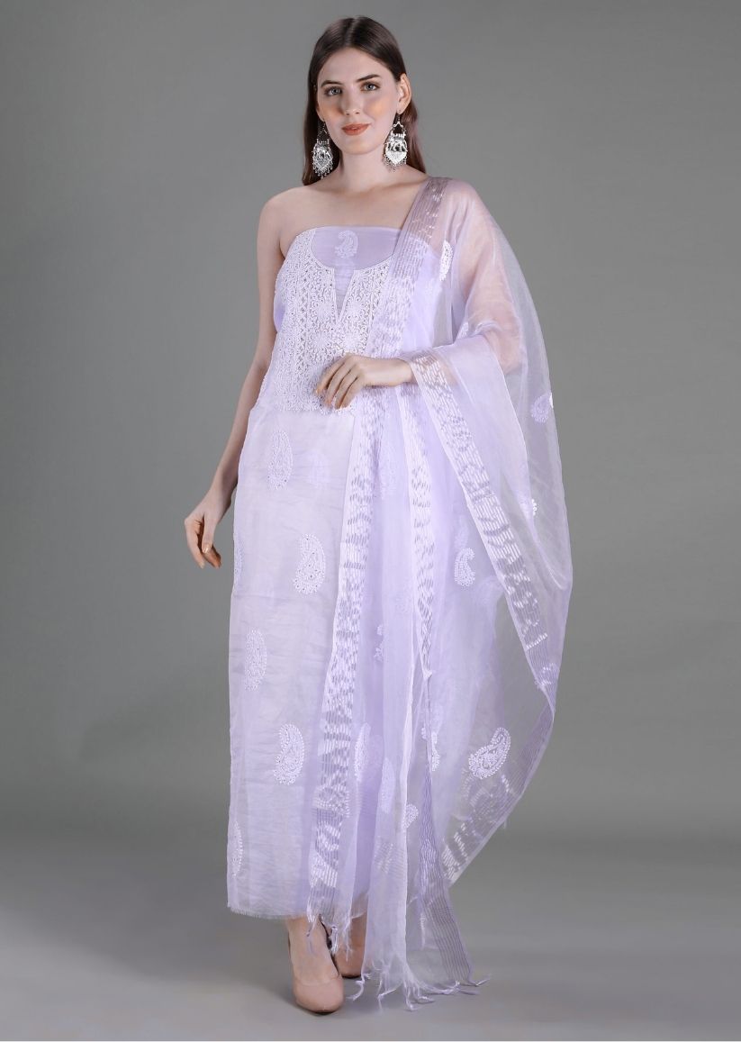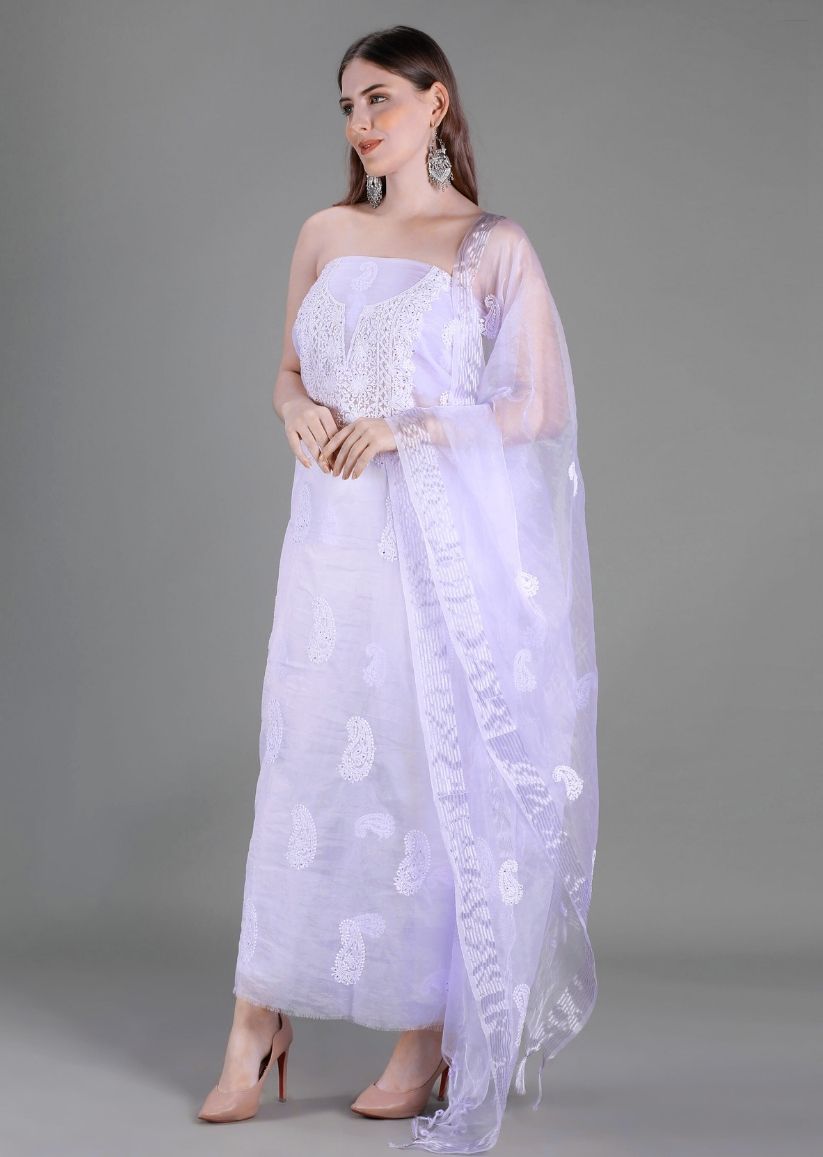 Ethereal and contemporary, this lavender unstitched Lucknowi chikankari kurta-dupatta set is crafted in lightweight, trending organza fabric, giving it a delicate sheer texture and effortless elegance.