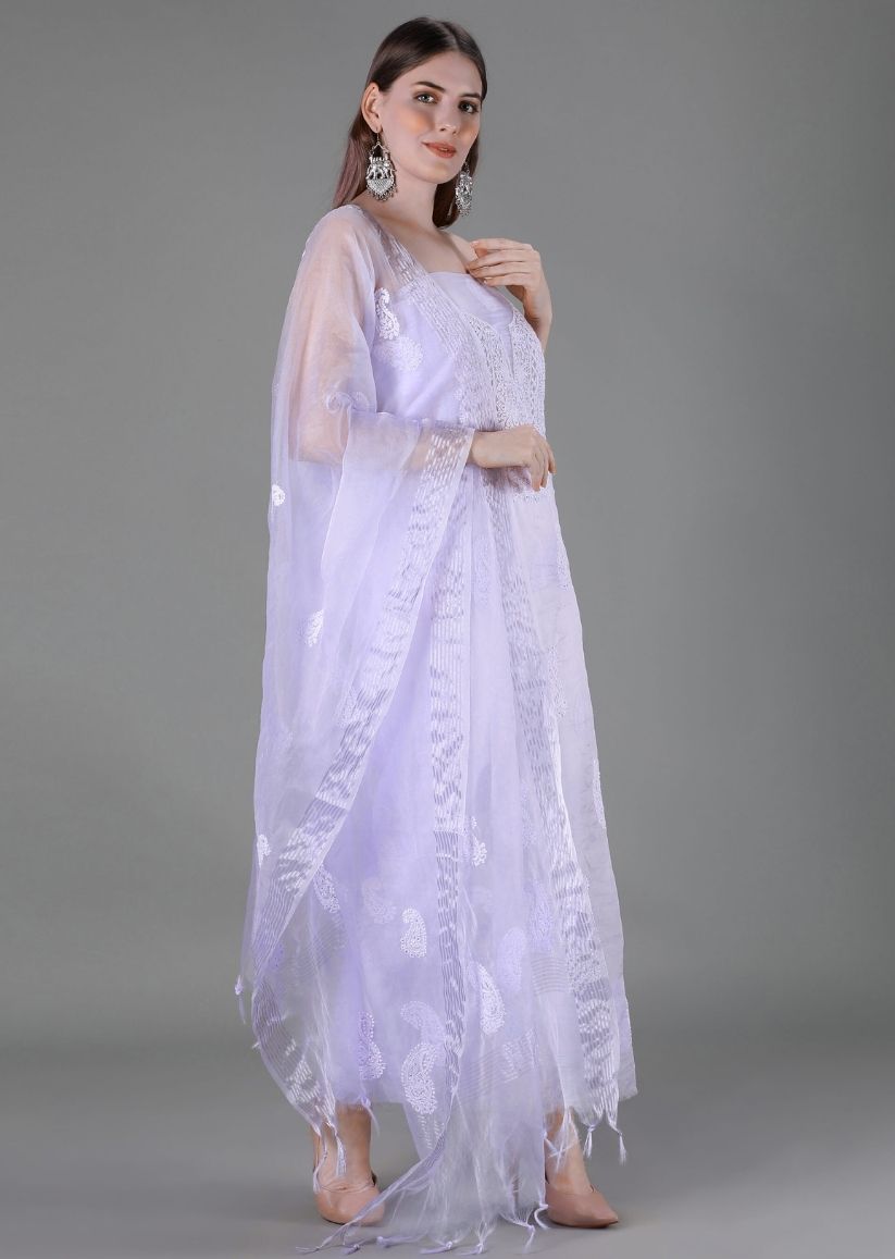 Firgun Lavender Lucknowi Chikankari Organza Unstitched Kurta & Dupatta Set