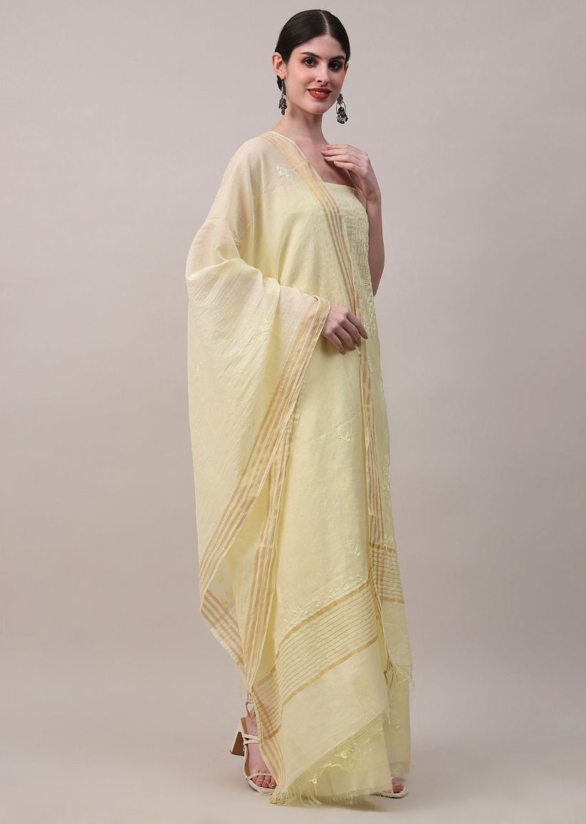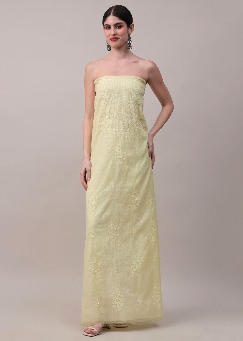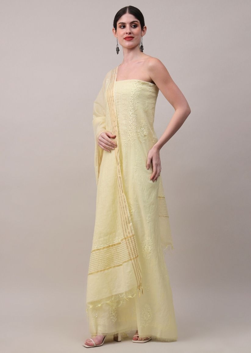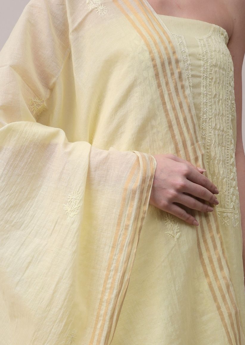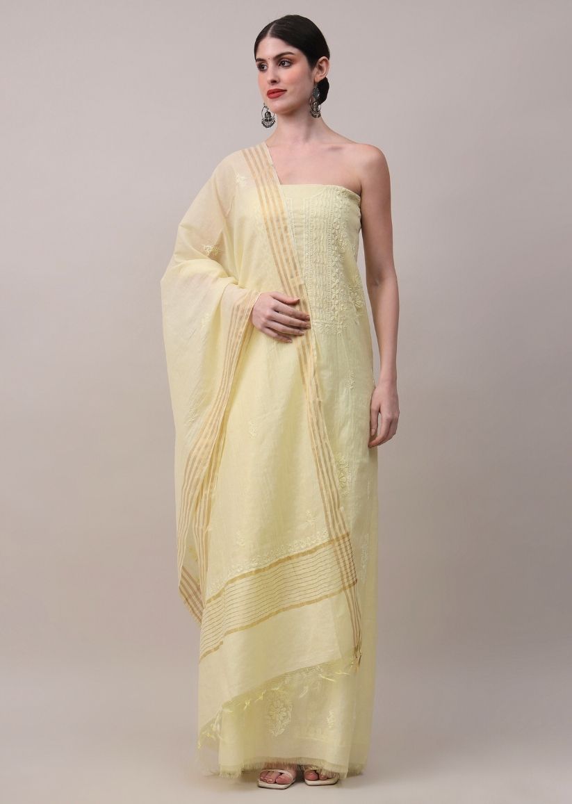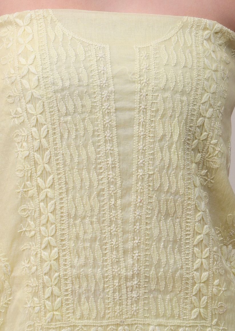Firgun Lemon Lucknowi Chikankari Mul Chanderi Unstitched Kurta & Dupatta Set