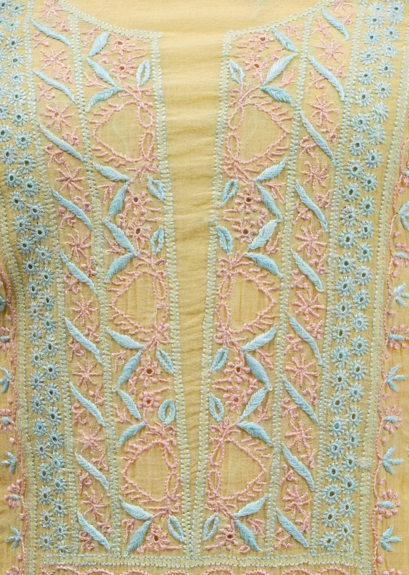 Firgun Lemon Lucknowi Chikankari Viscose Georgette Unstitched Kurta & Dupatta Set