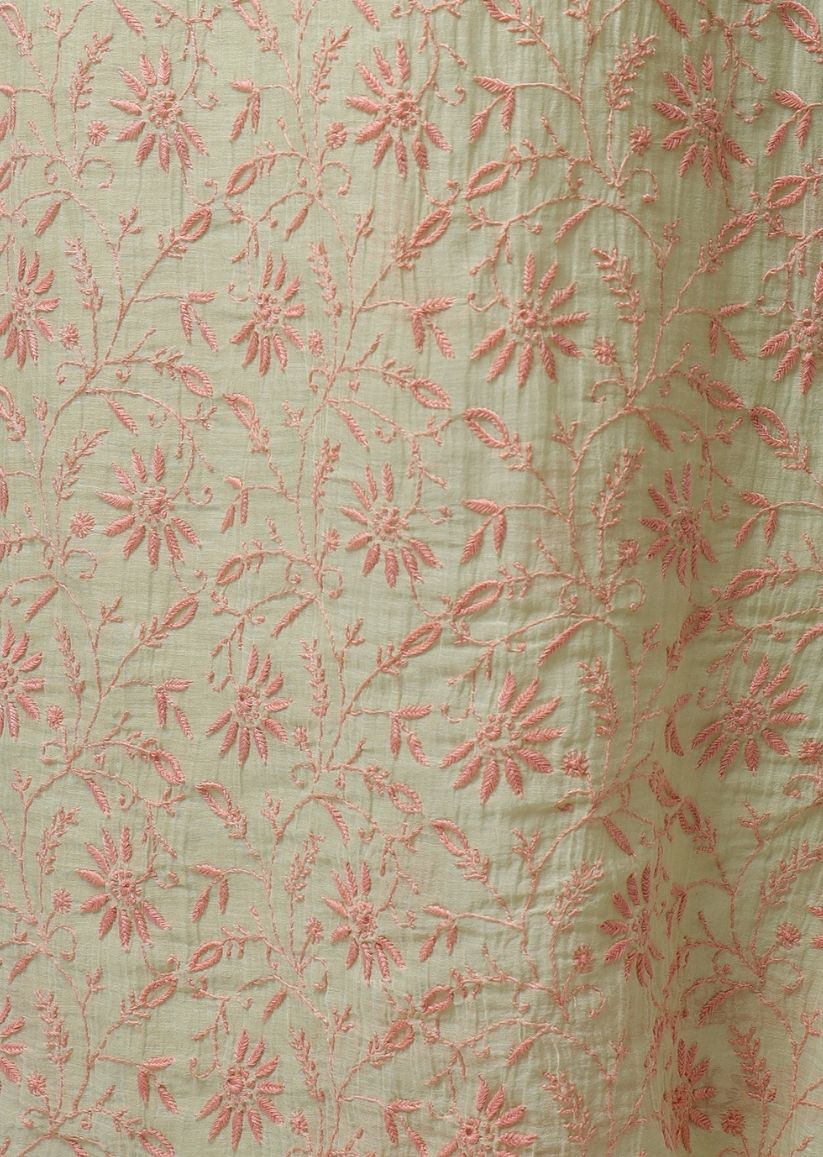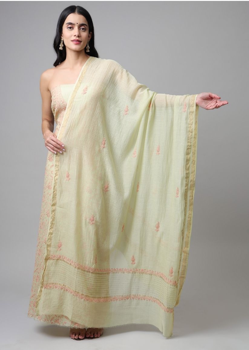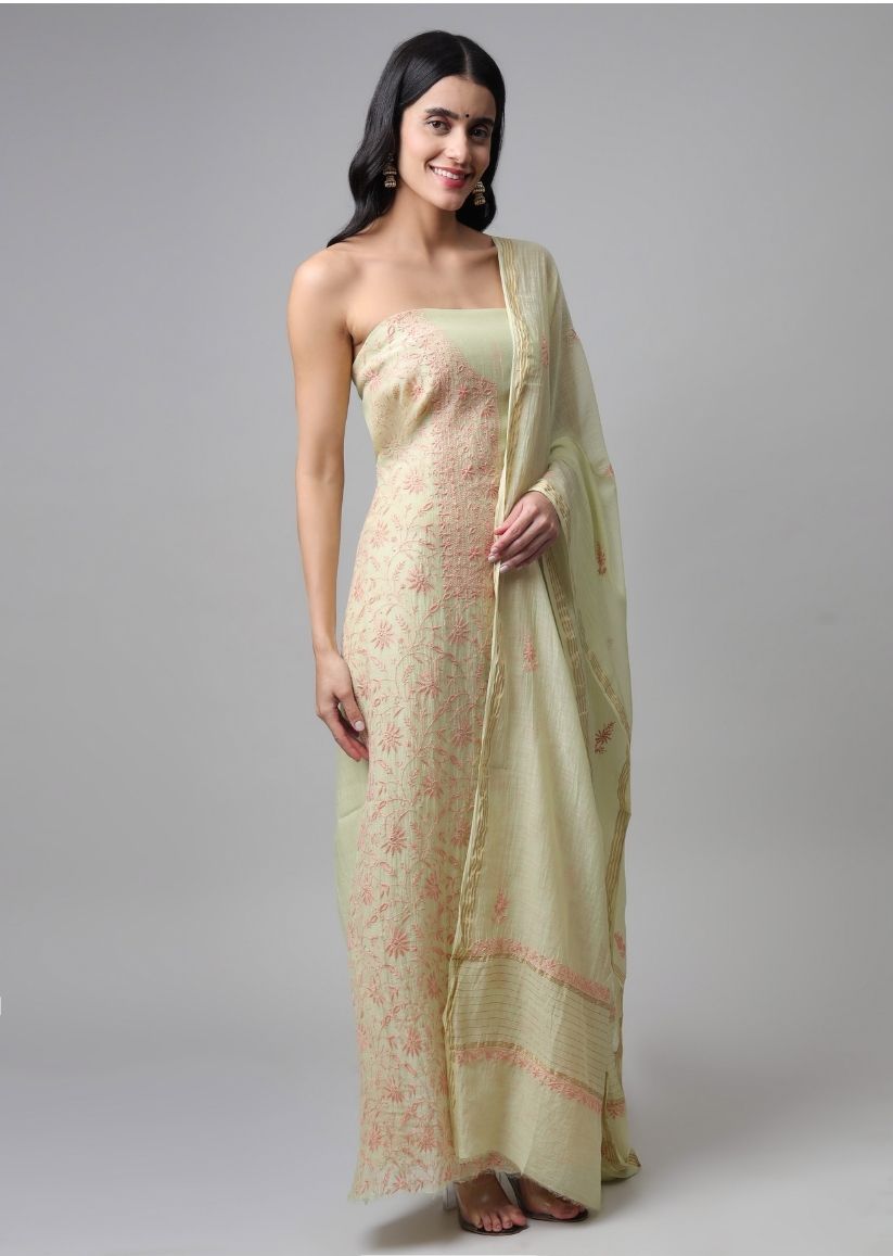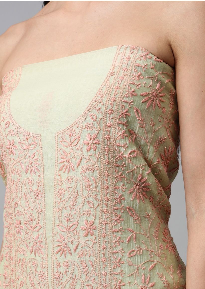 Firgun Light Green Lucknowi Chikankari Mul Chanderi Unstitched Kurta & Dupatta Set