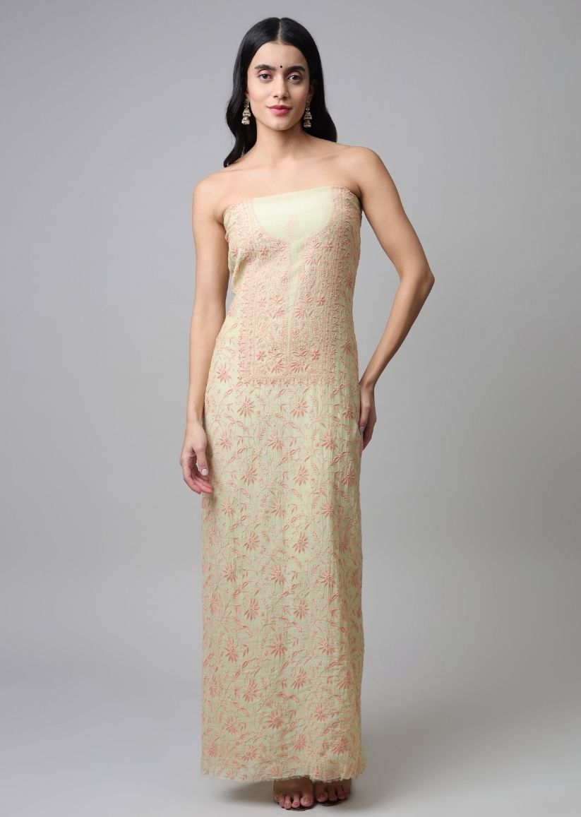 Ethereal and intricately crafted, this light green unstitched chikankari kurta-dupatta set is a testament to traditional artistry and meticulous craftsmanship.