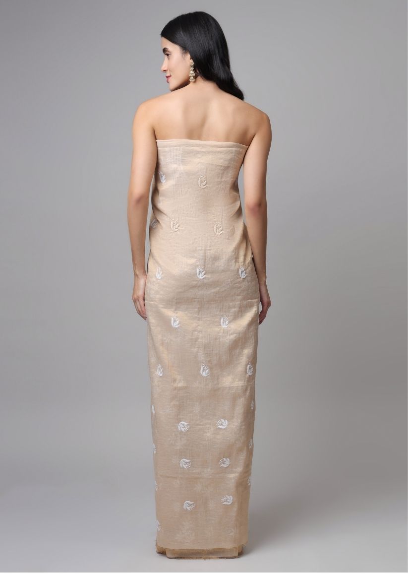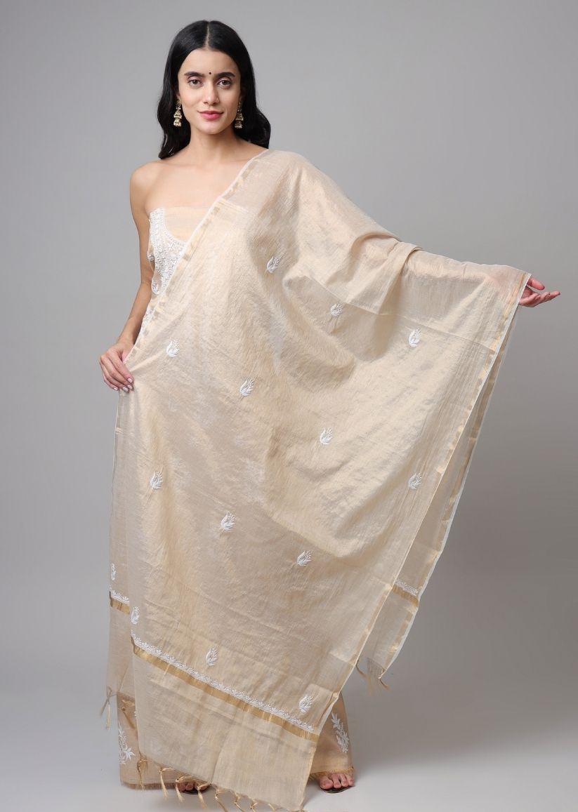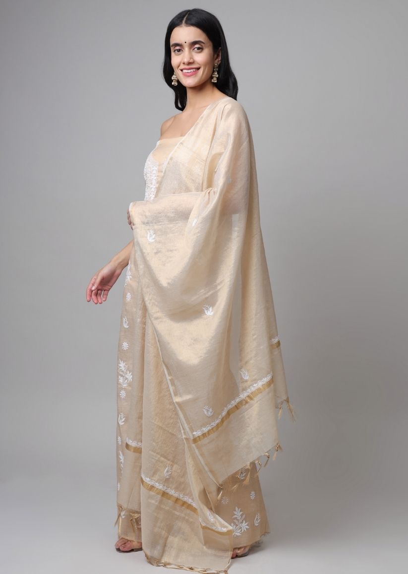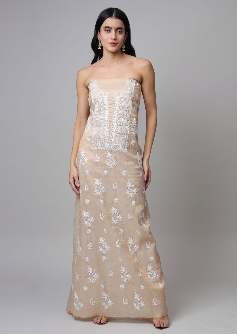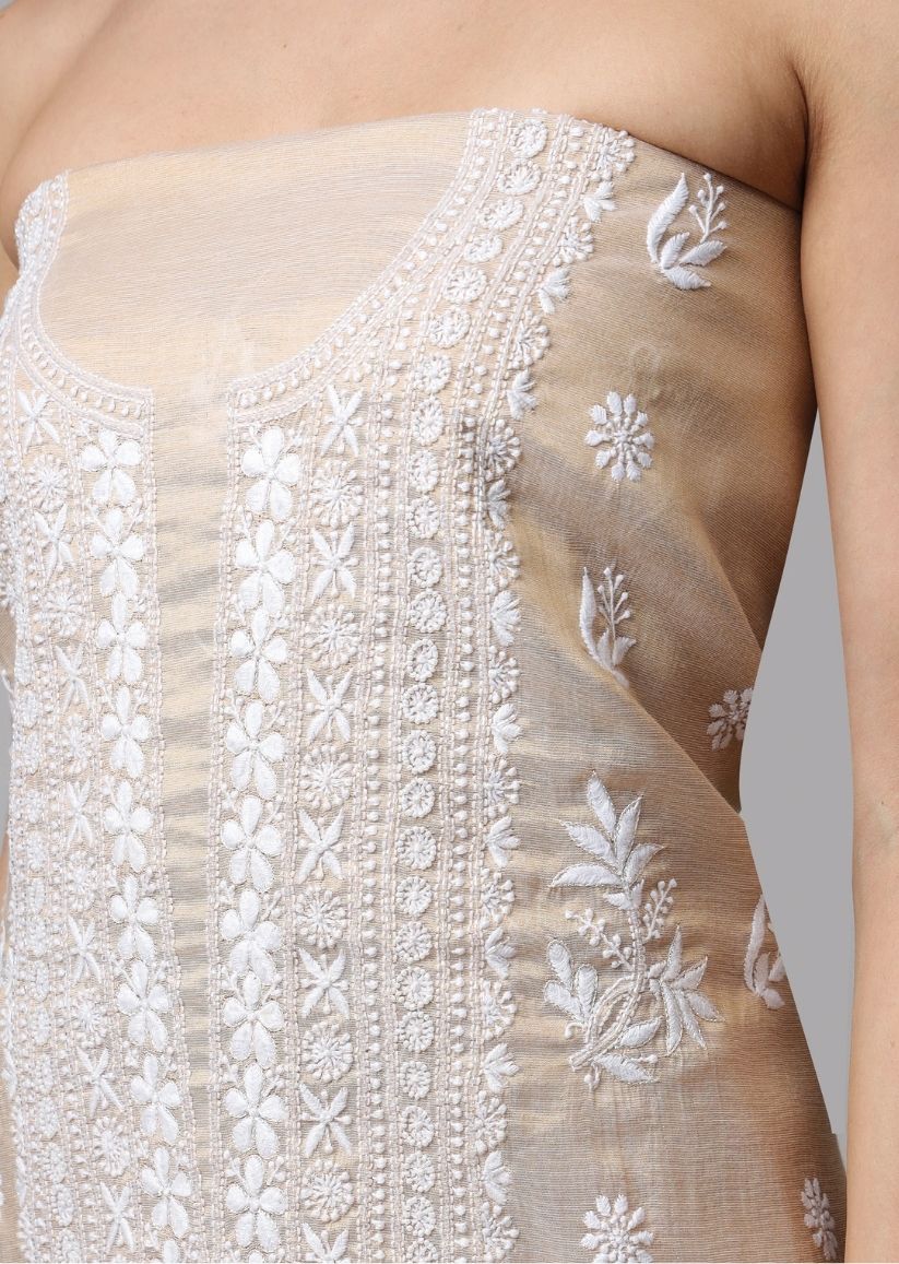 Firgun Lucknowi Chikankari Pearl Work Banarasi Tissue Unstitched Kurta & Dupatta Set