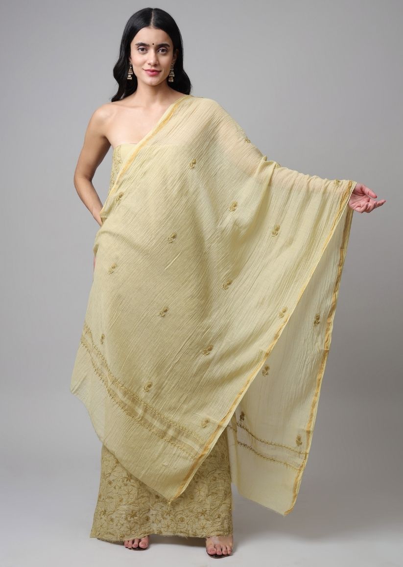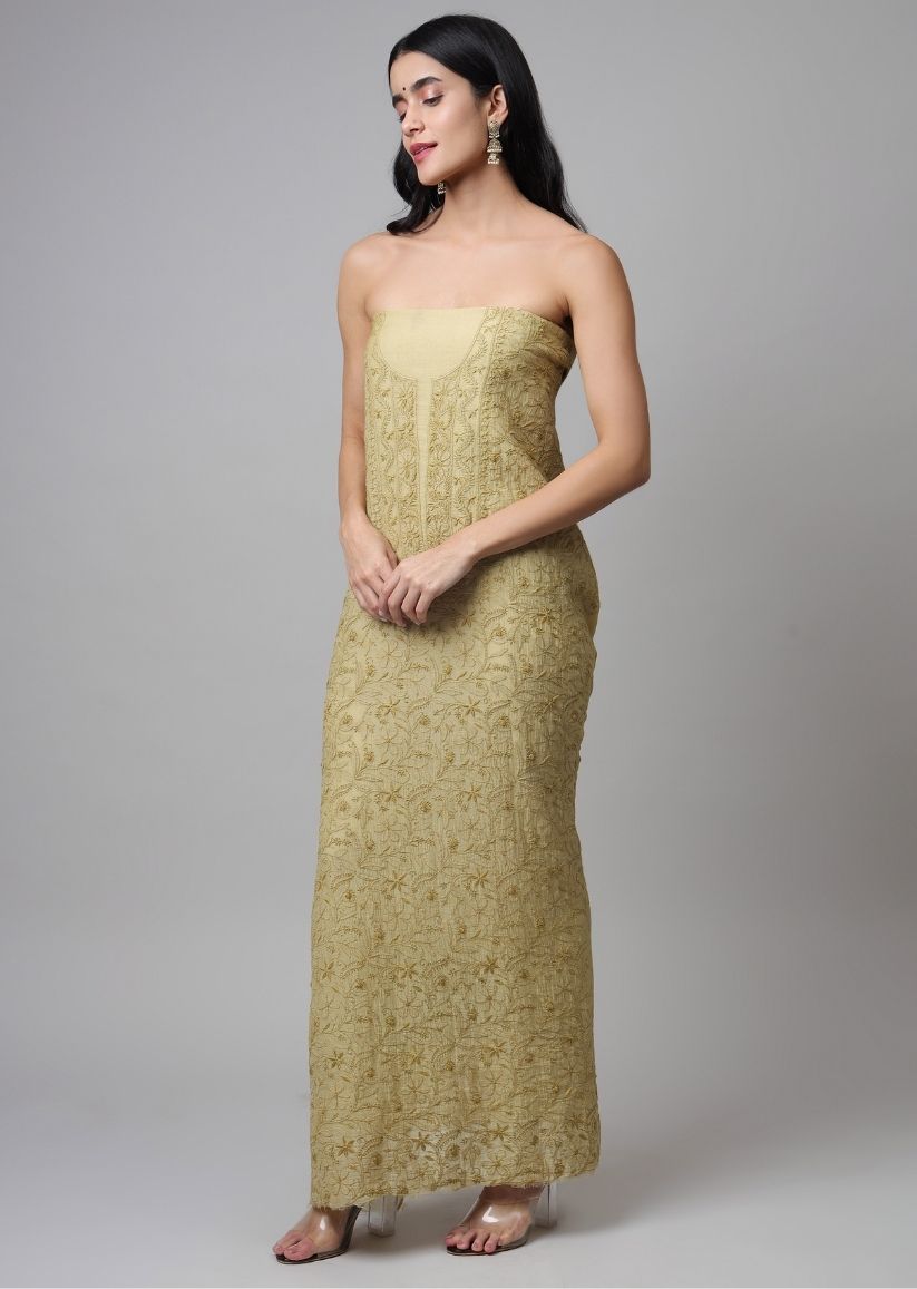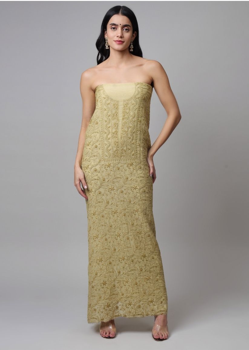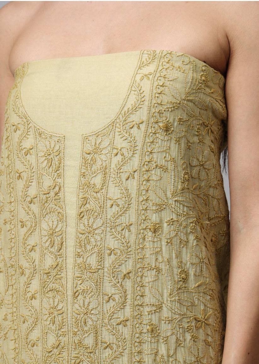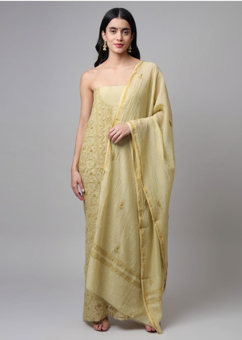 Firgun Mehendi Green Lucknowi Chikankari Mul Chanderi Unstitched Kurta & Dupatta Set