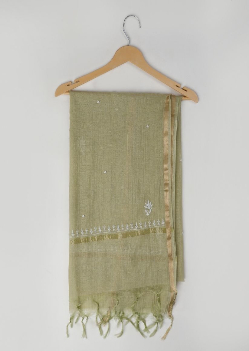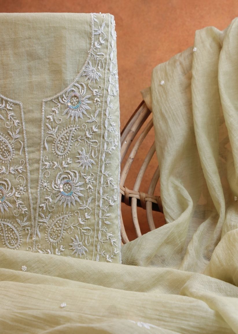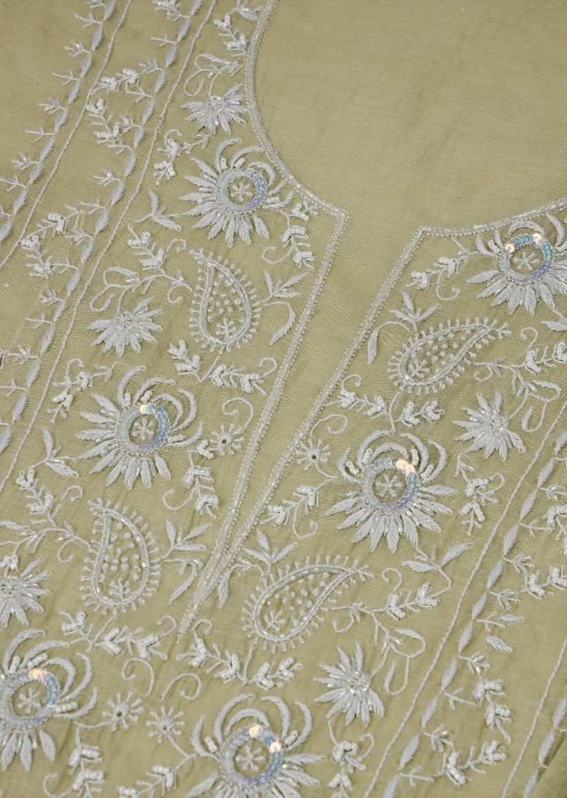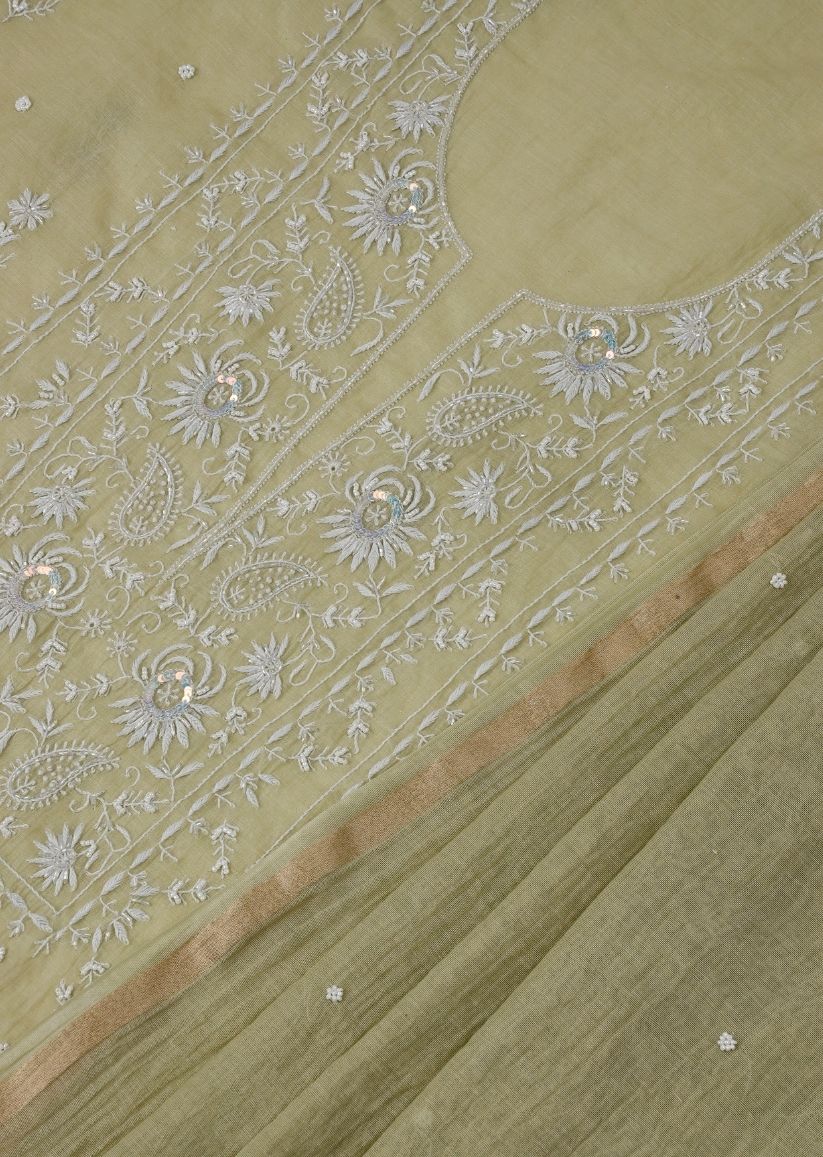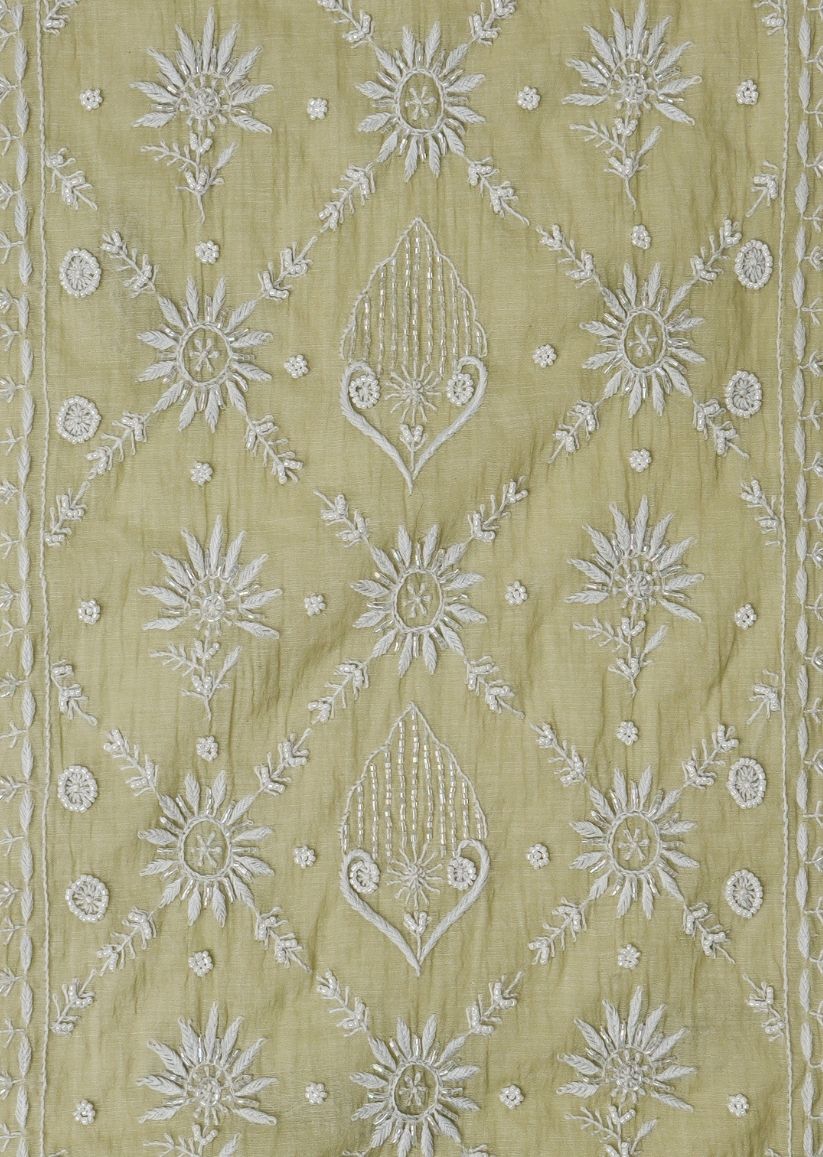 Firgun Mehendi Green Lucknowi Chikankari Mul Chanderi Unstitched Kurta & Dupatta Set