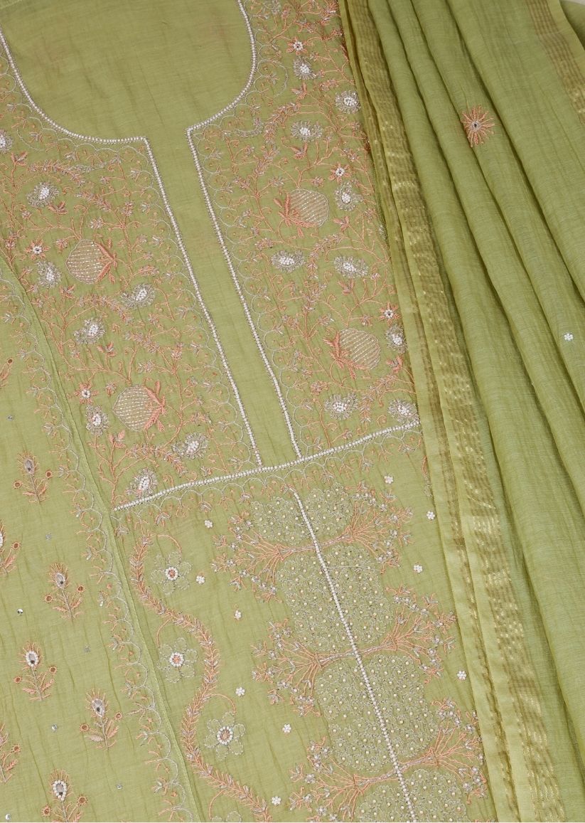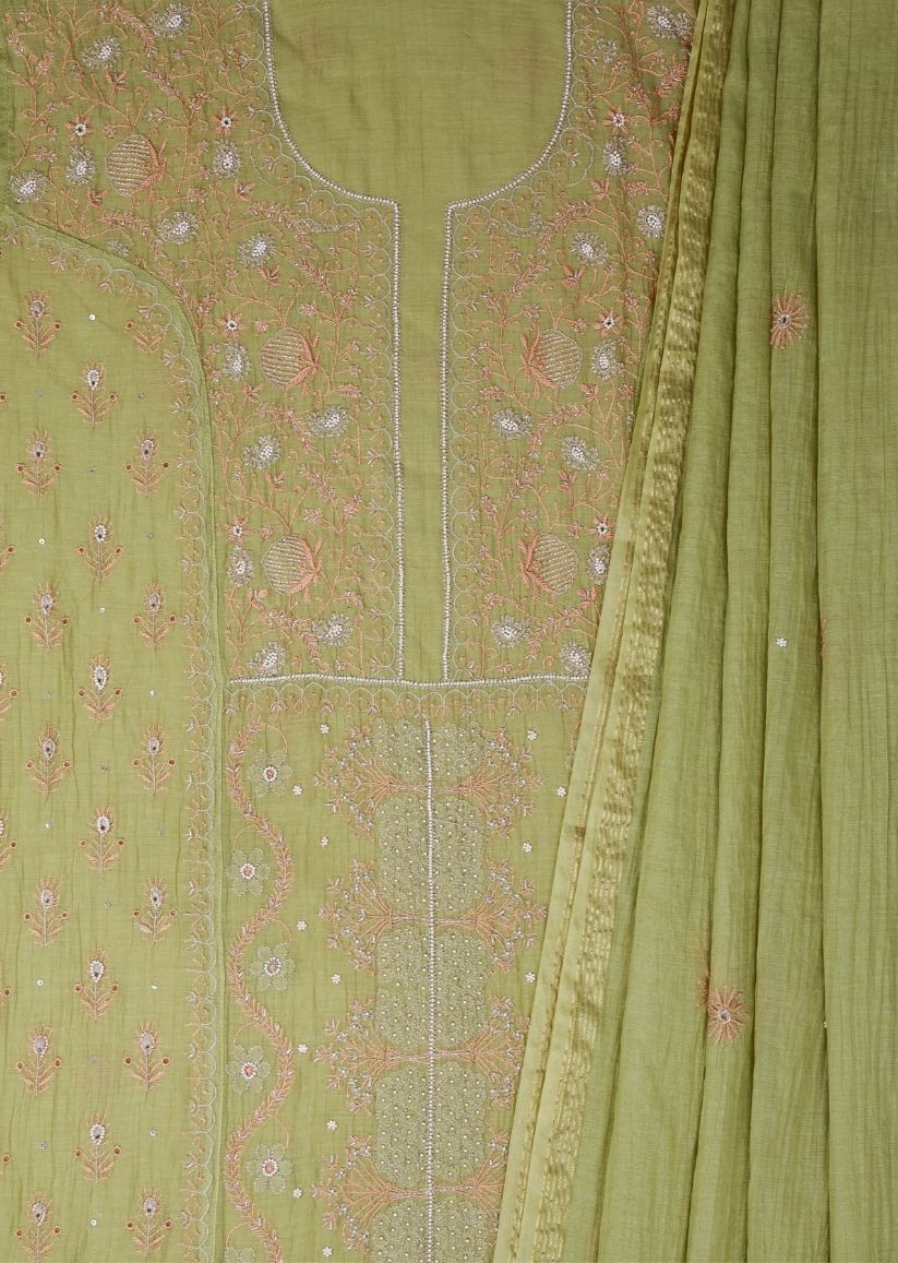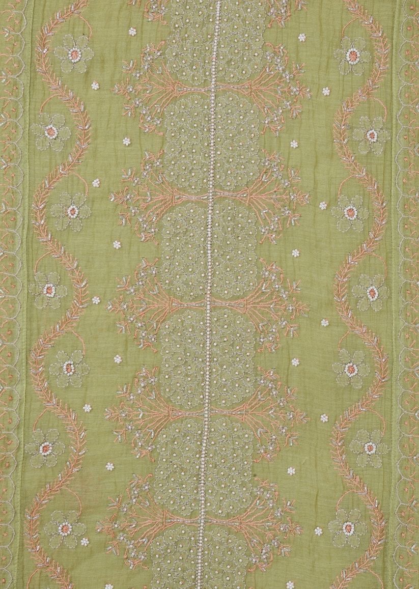 Firgun Mehendi Green Lucknowi Chikankari & Pearl Work Mul Chanderi Unstitched Kurta & Dupatta Set
