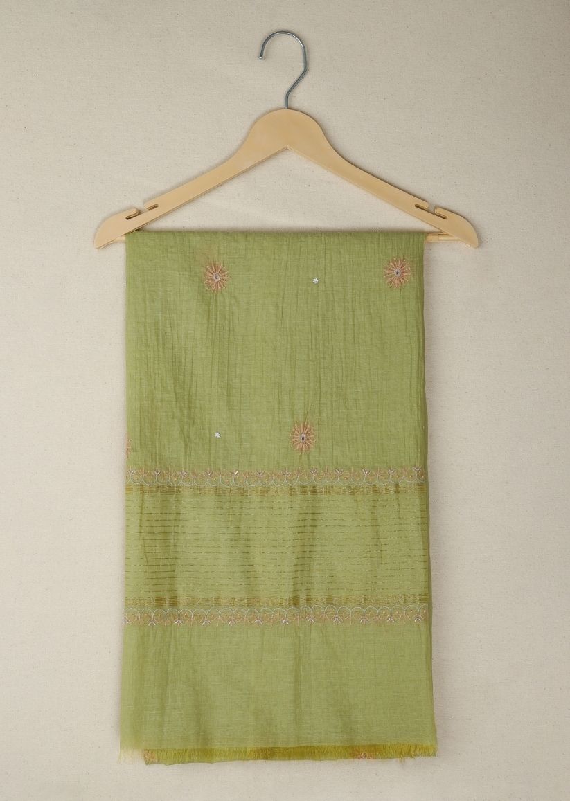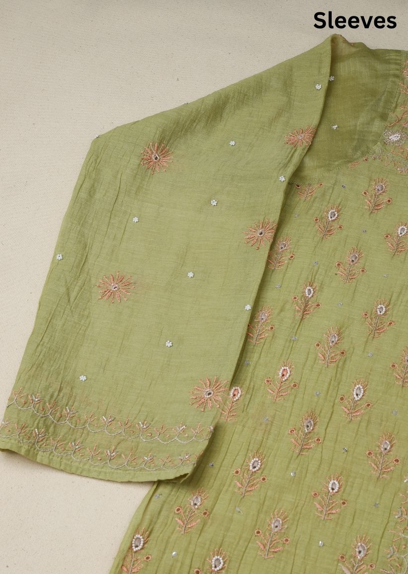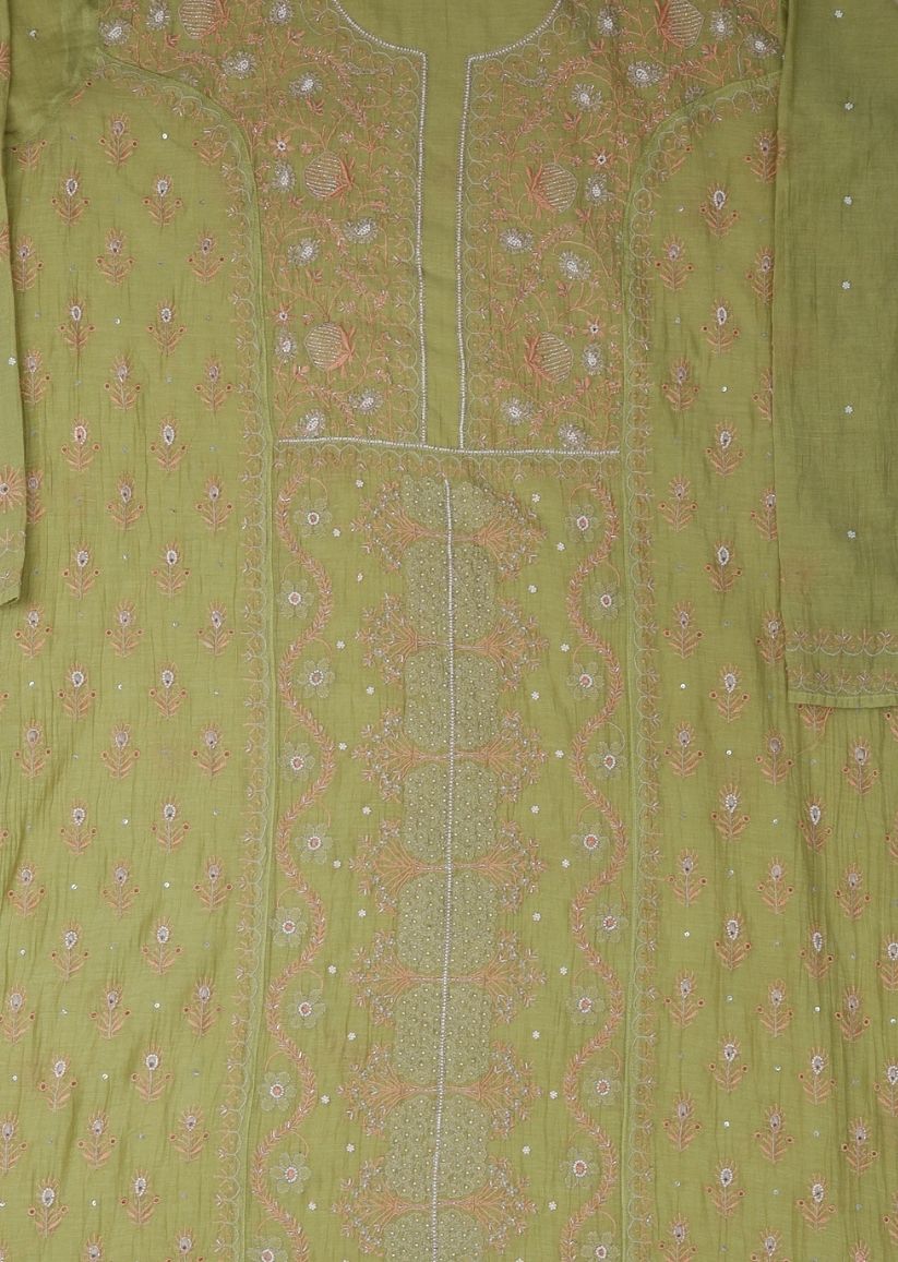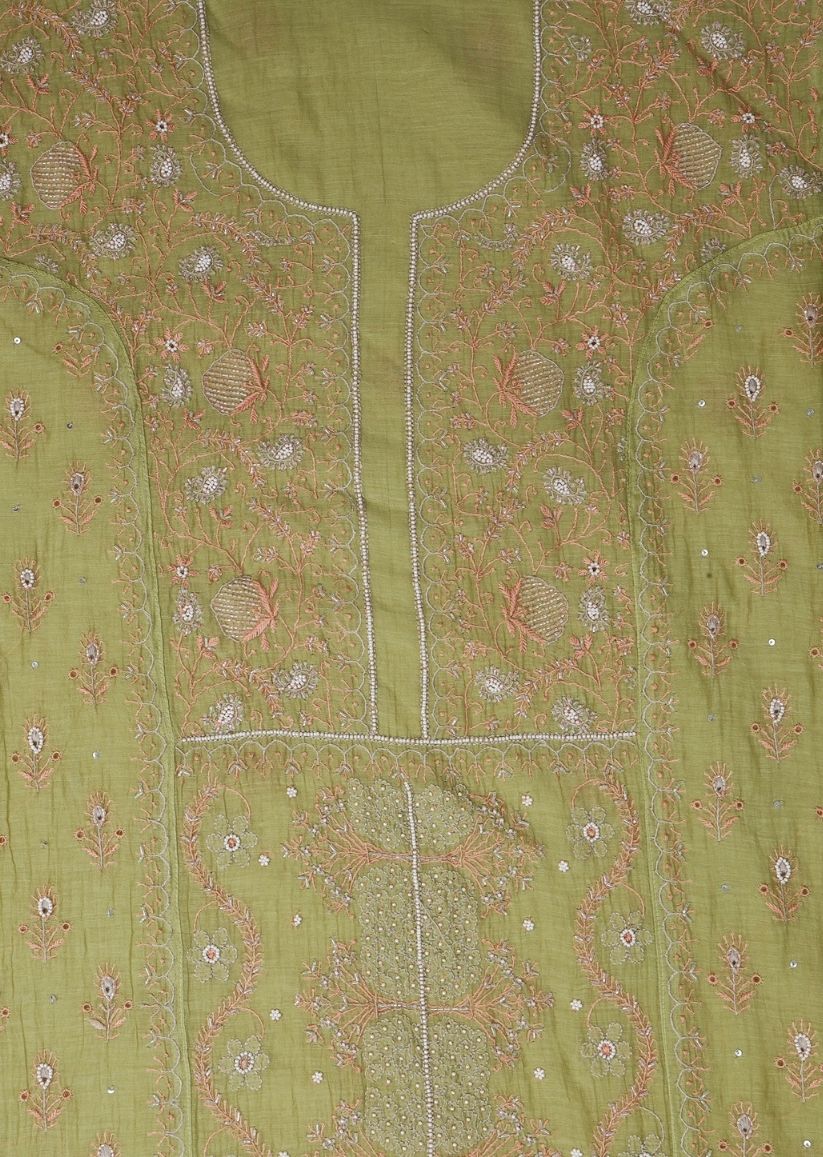 Firgun Mehendi Green Lucknowi Chikankari & Pearl Work Mul Chanderi Unstitched Kurta & Dupatta Set
