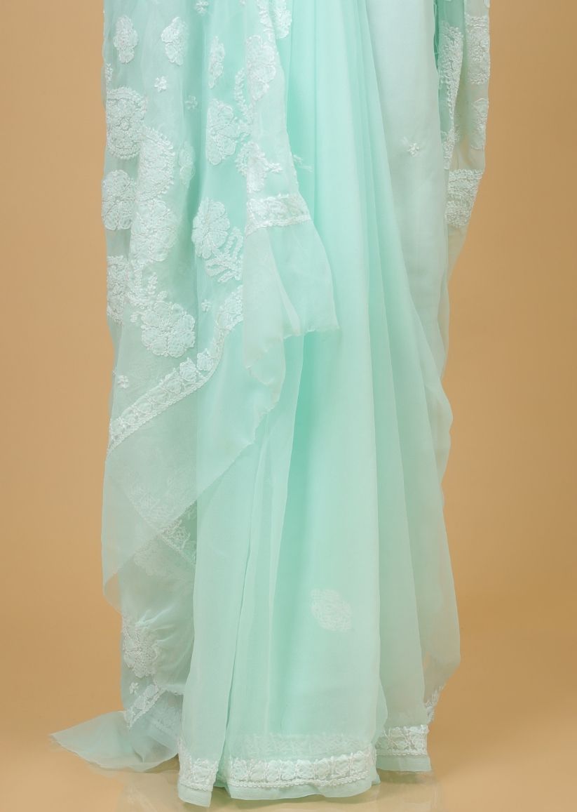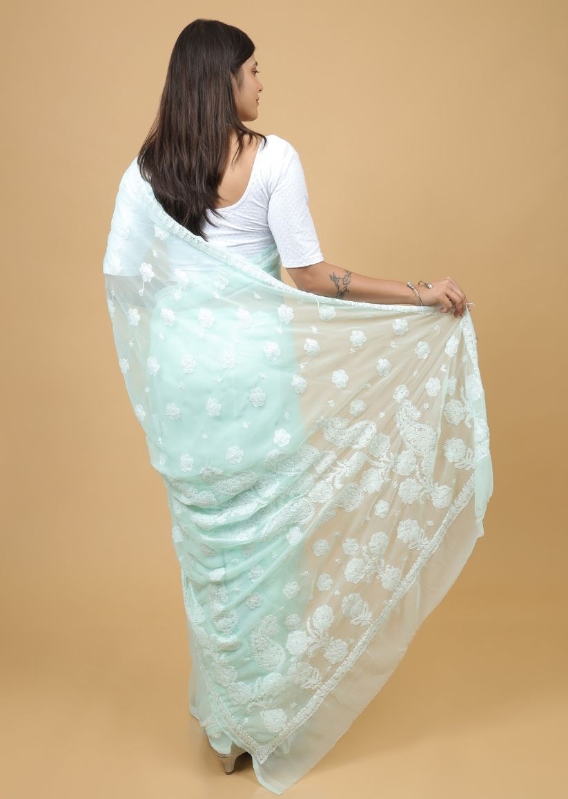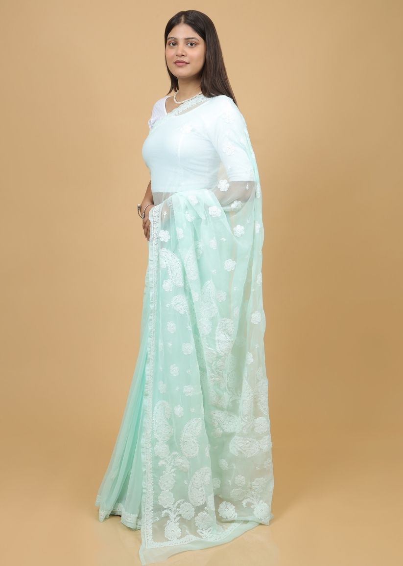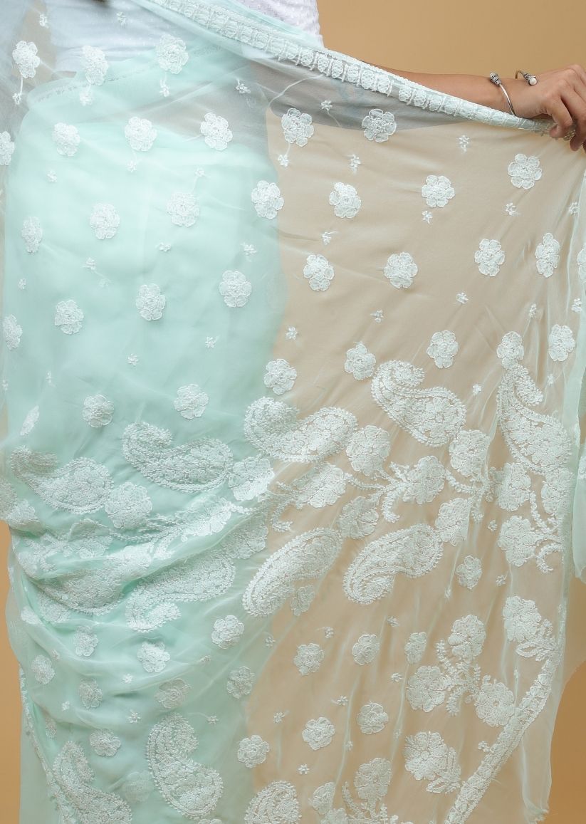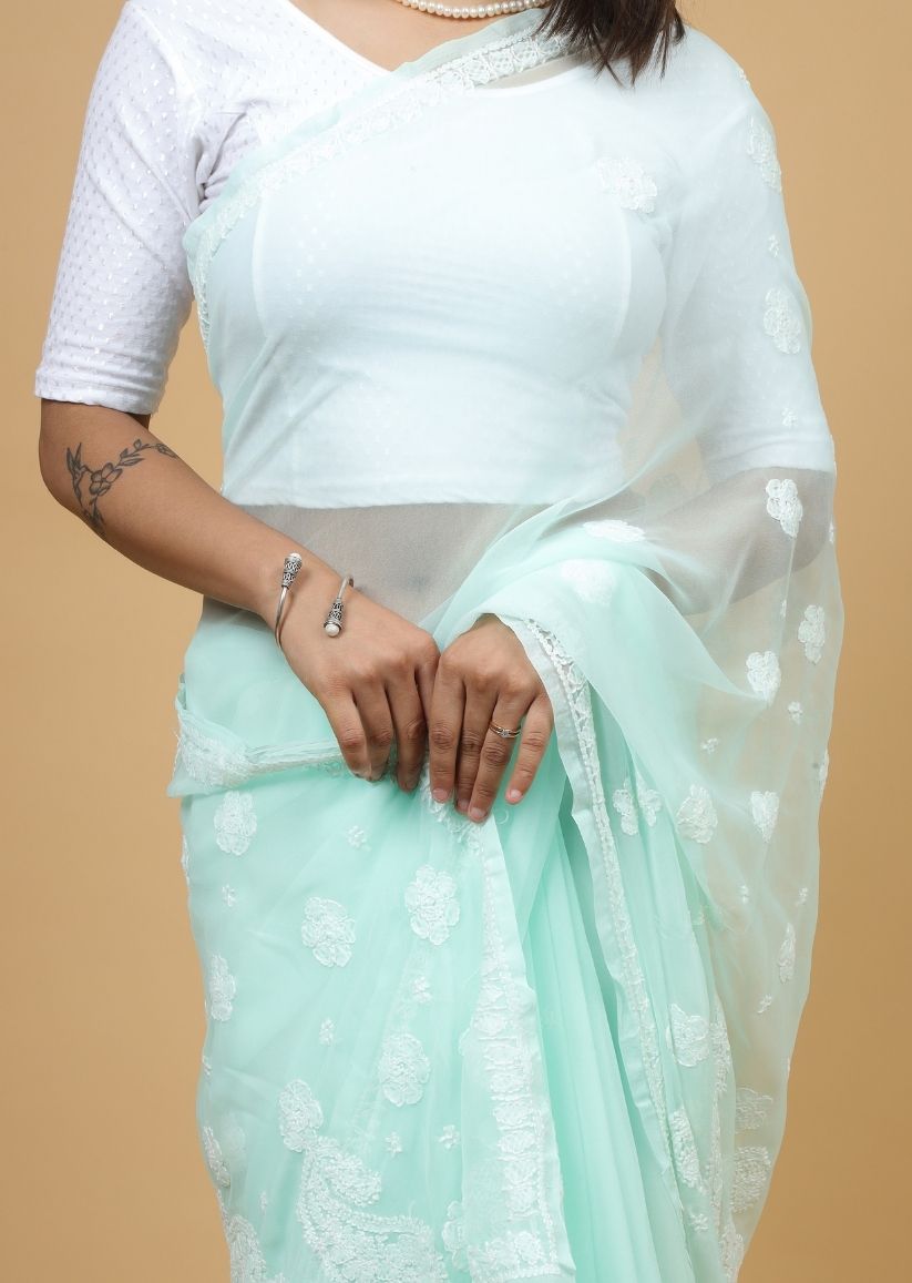 Firgun Mint Green Lucknowi Chikankari Georgette Saree with Unstitched Blouse Piece