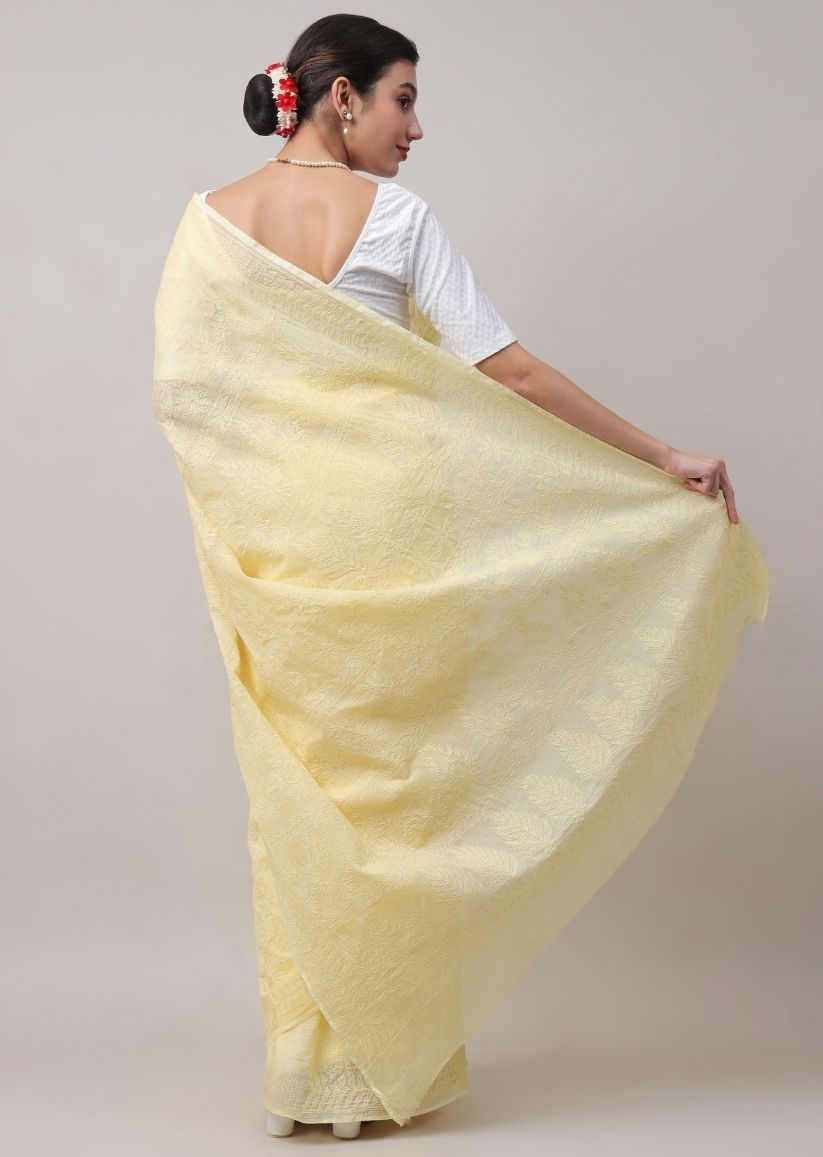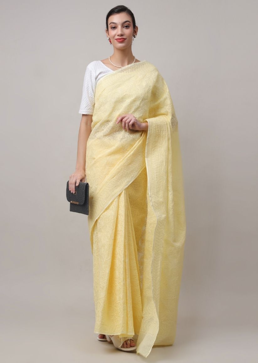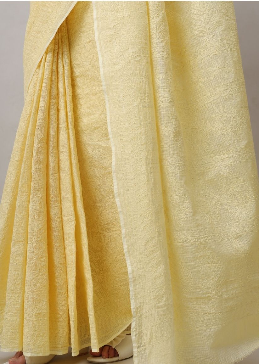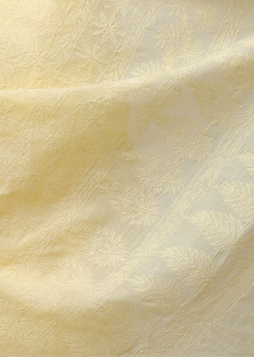 Firgun Mustard Lucknowi Chikankari Kota Doria Tepchi Work Saree with Blouse Piece
