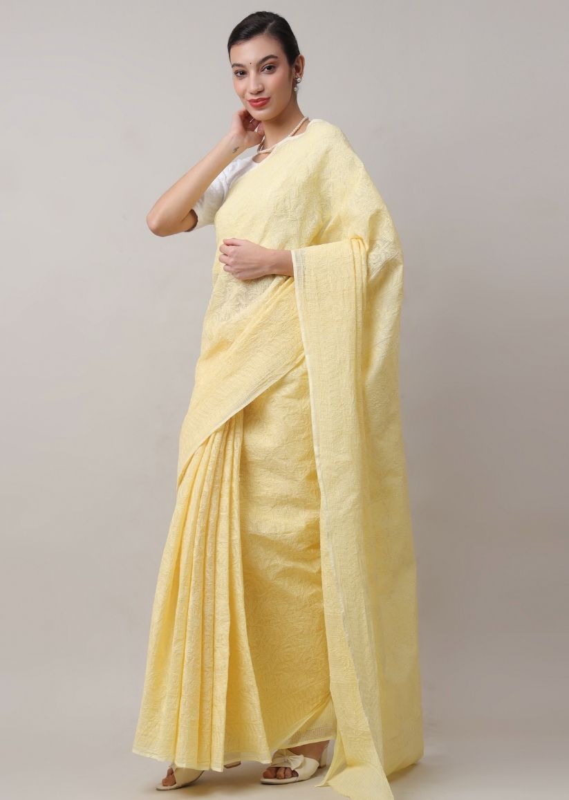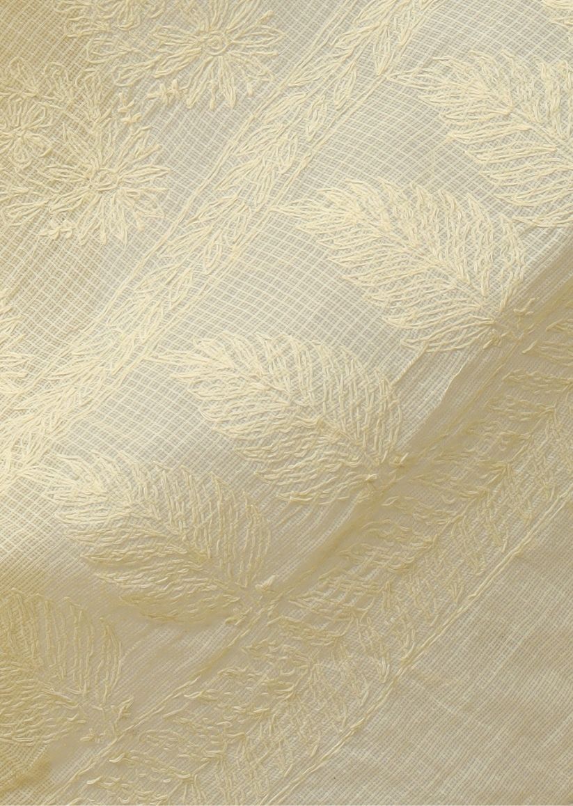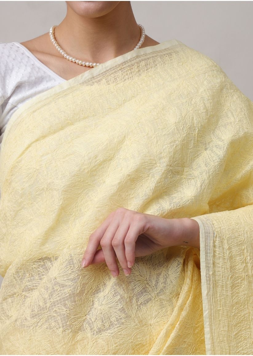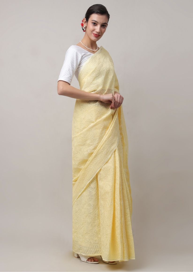 Firgun Mustard Lucknowi Chikankari Kota Doria Tepchi Work Saree with Blouse Piece