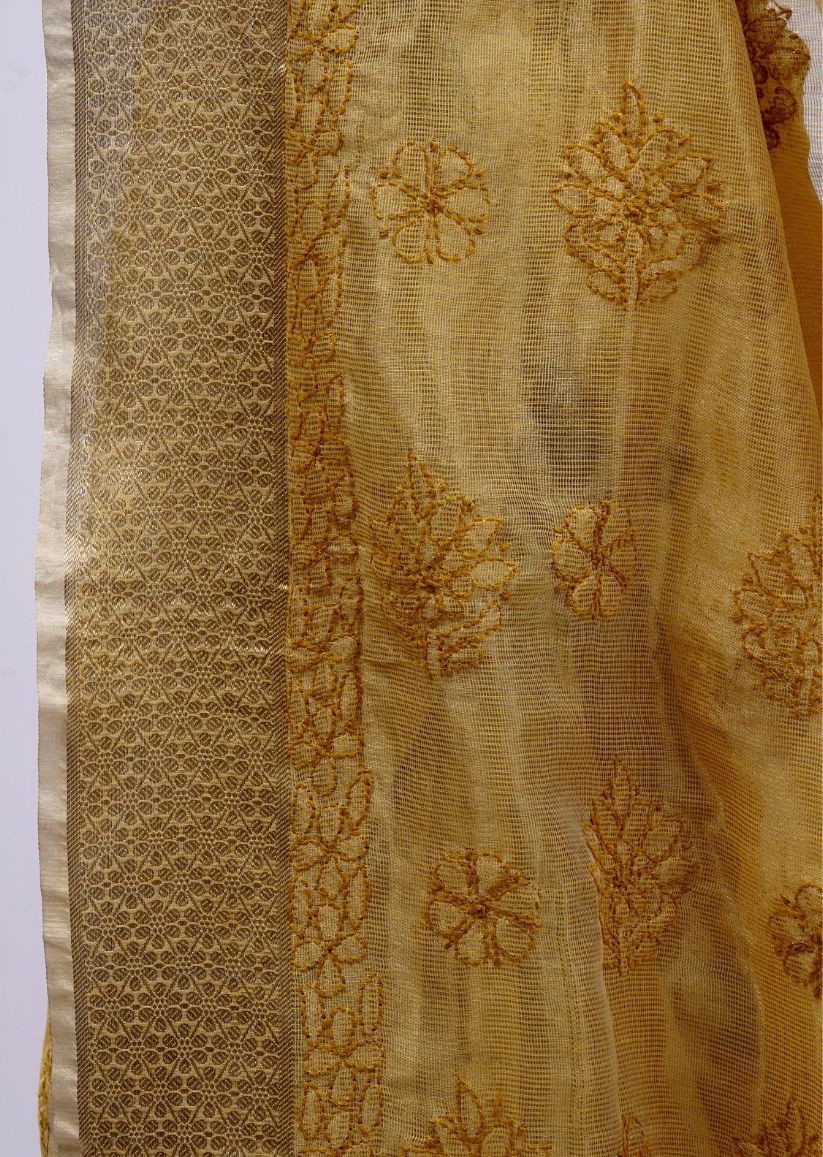Firgun Mustard Lucknowi Chikankari Organza Tissue Saree with Unstitched Blouse Piece