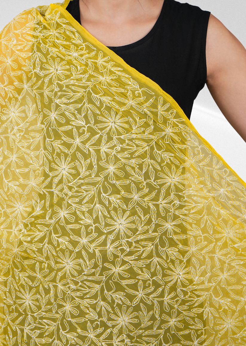 Firgun Mustard Yellow Tepchi Lucknowi Chikankari Georgette Dupatta