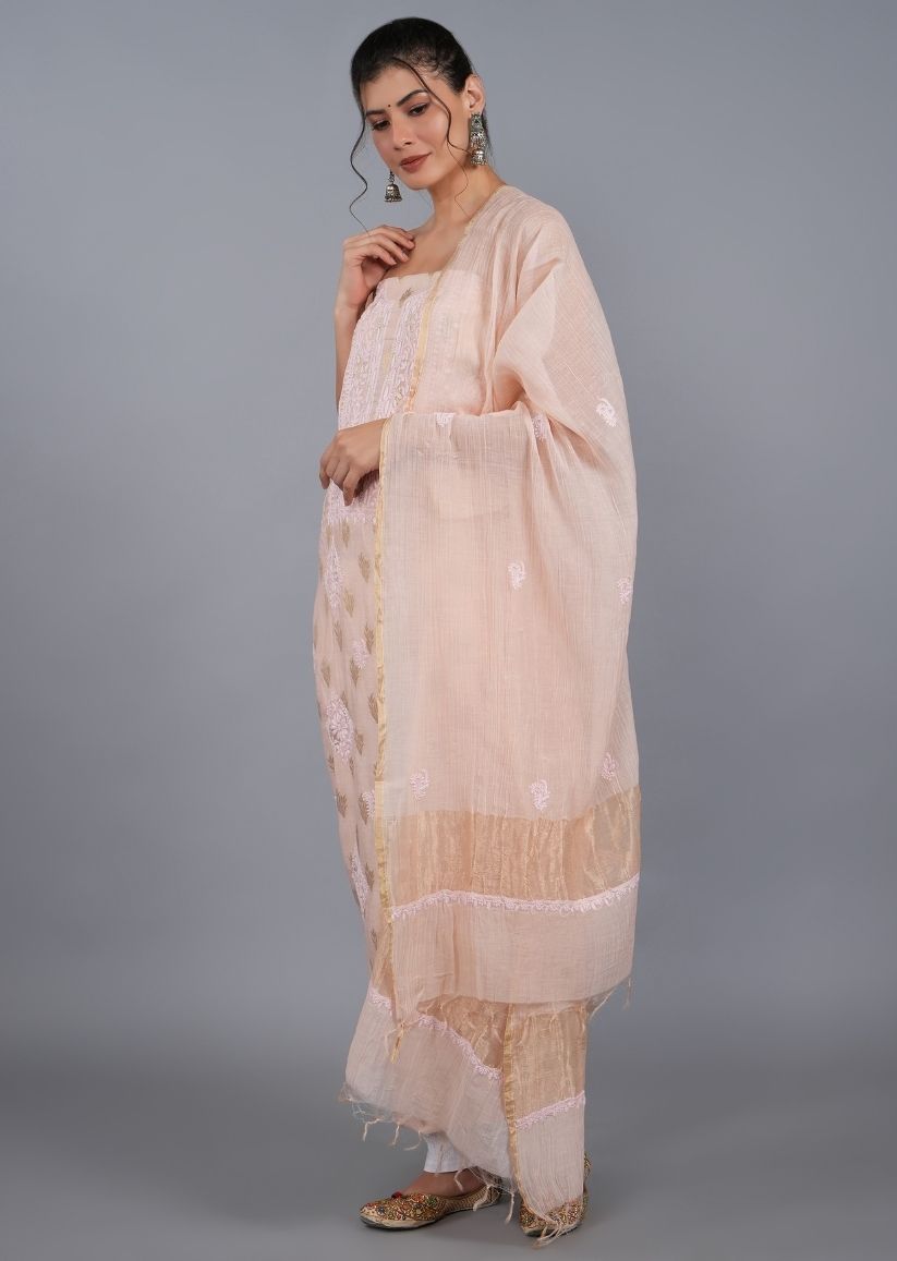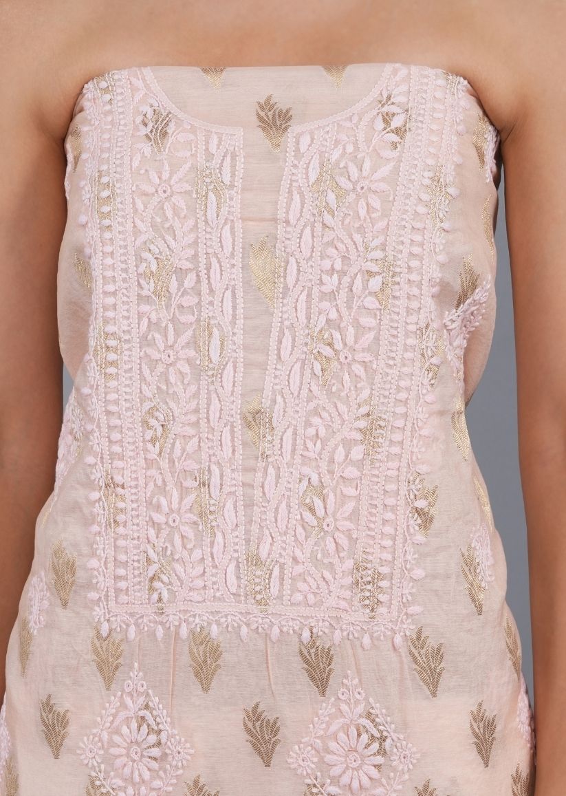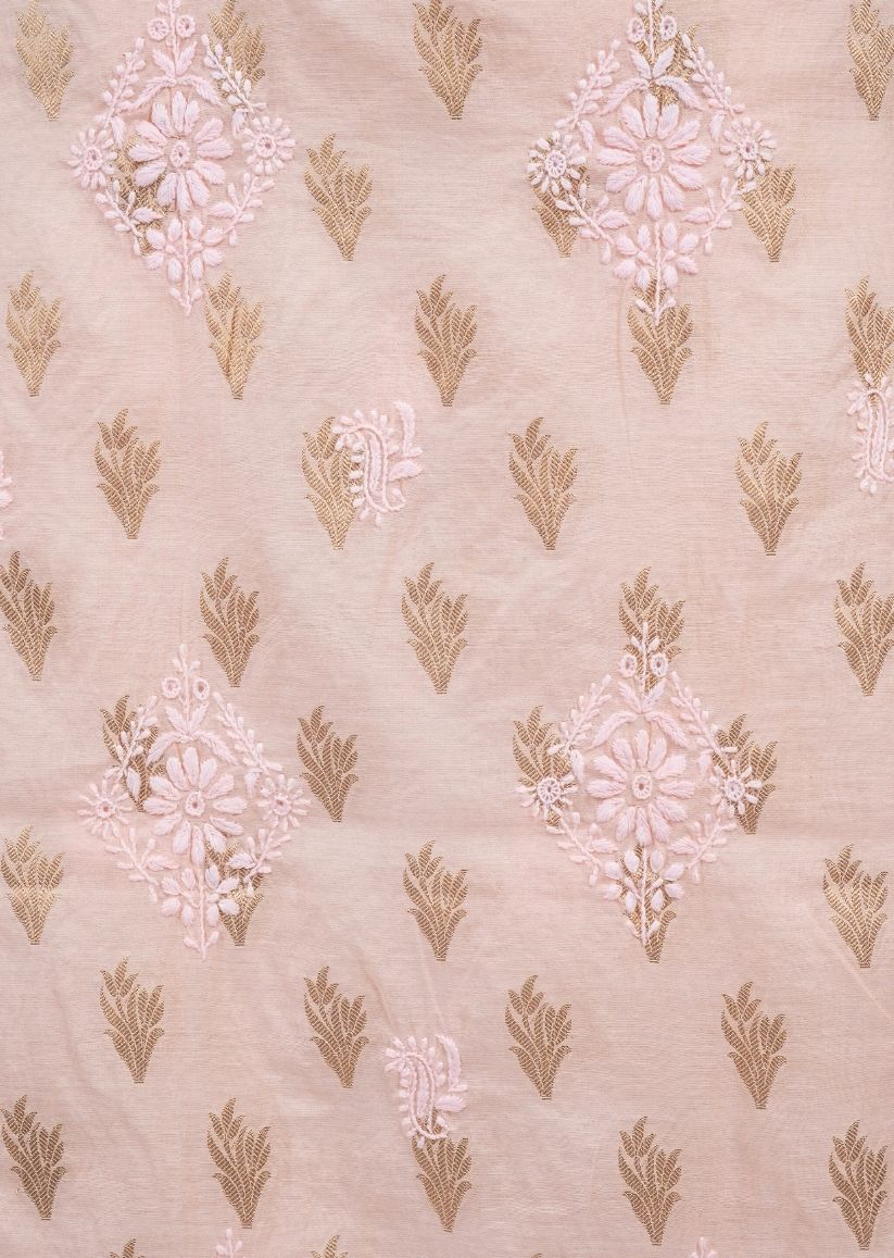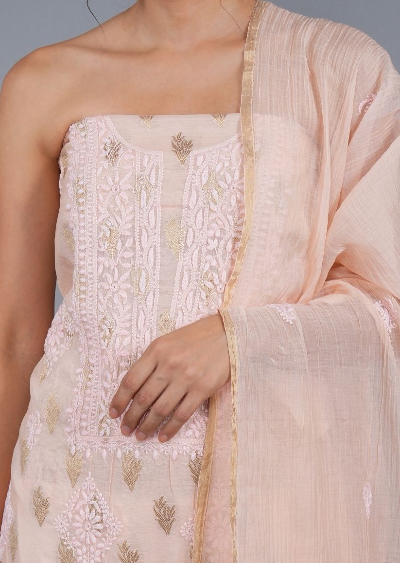 Firgun Peach Lucknowi Chikankari Chanderi Unstitched Kurta & Dupatta Set