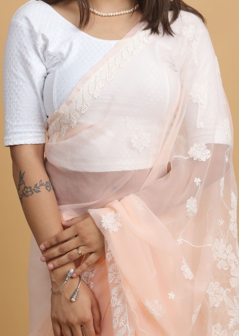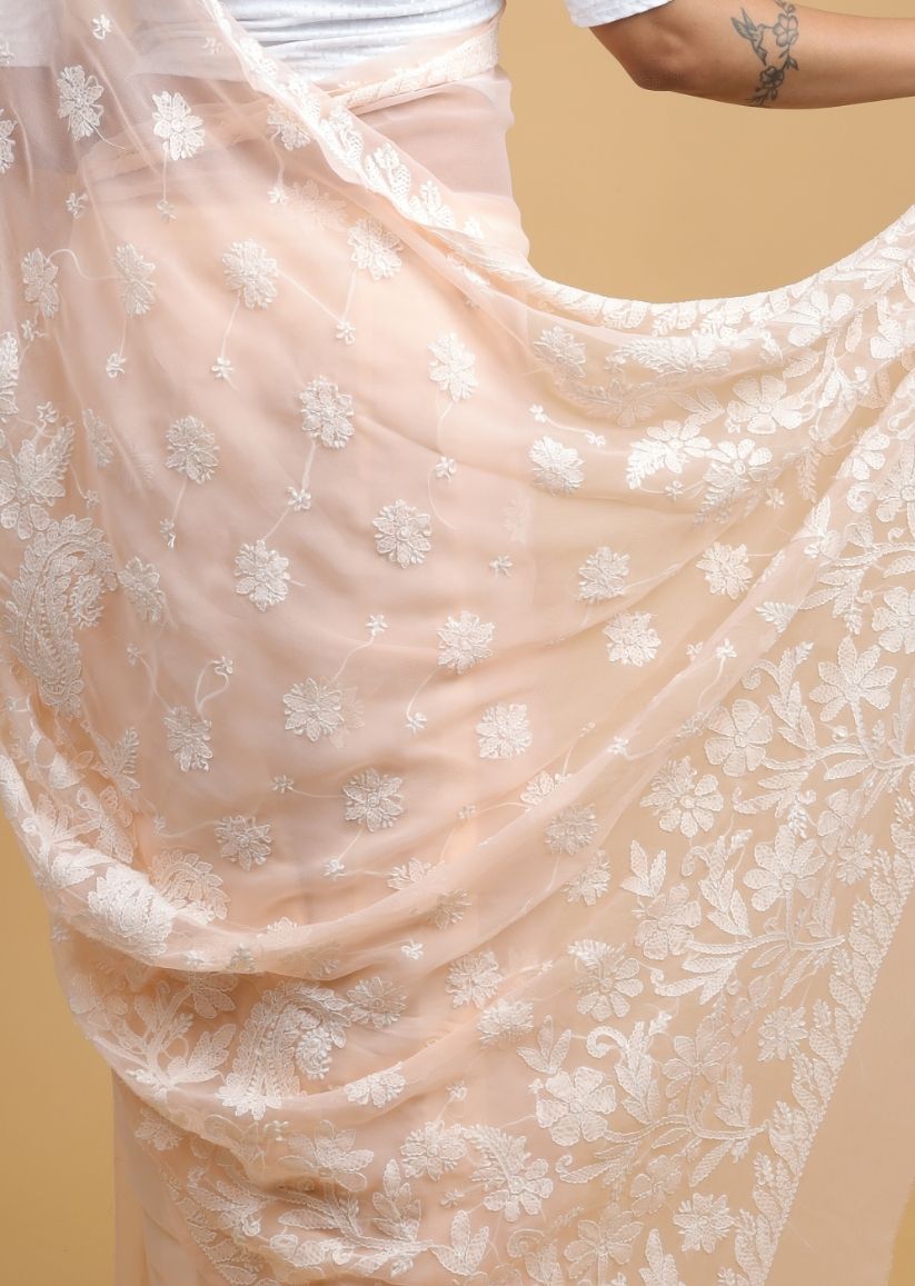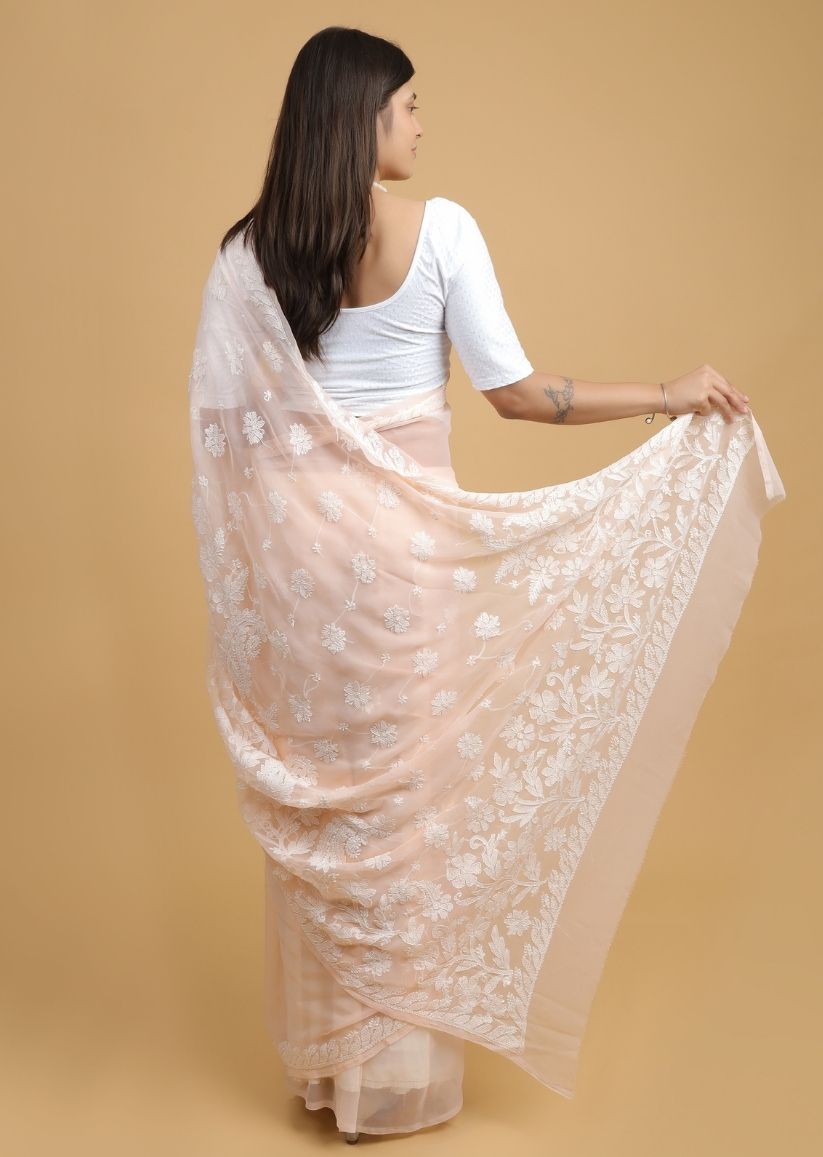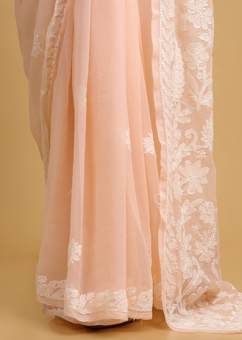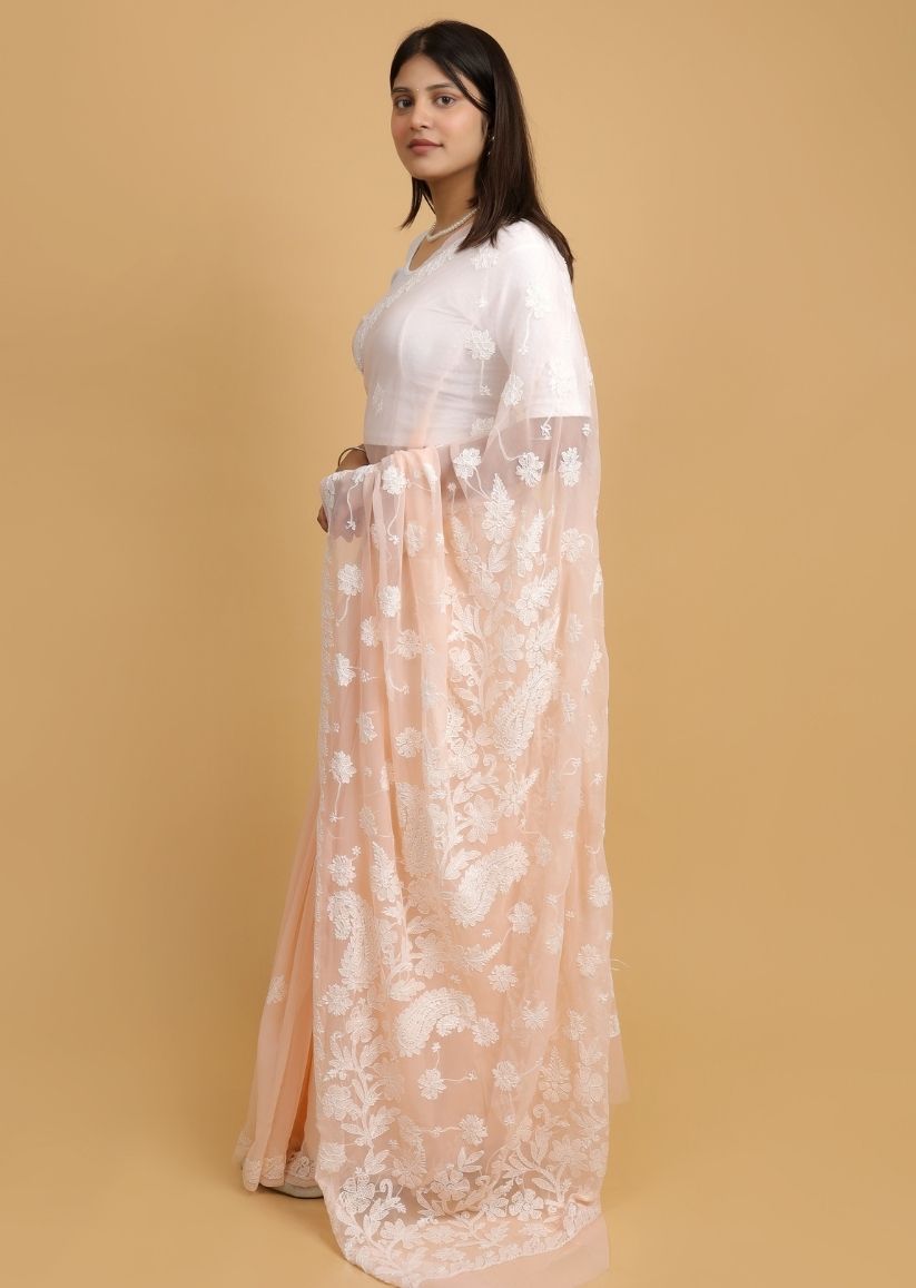 Firgun Peach Lucknowi Chikankari Georgette Saree with Unstitched Blouse Piece