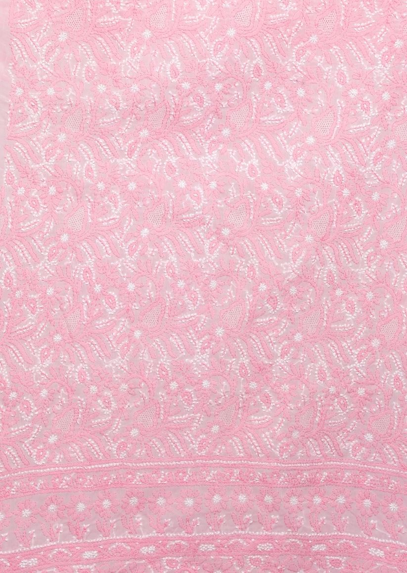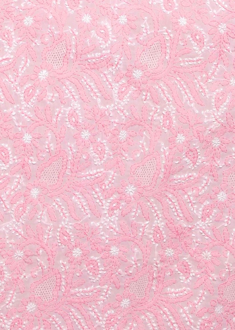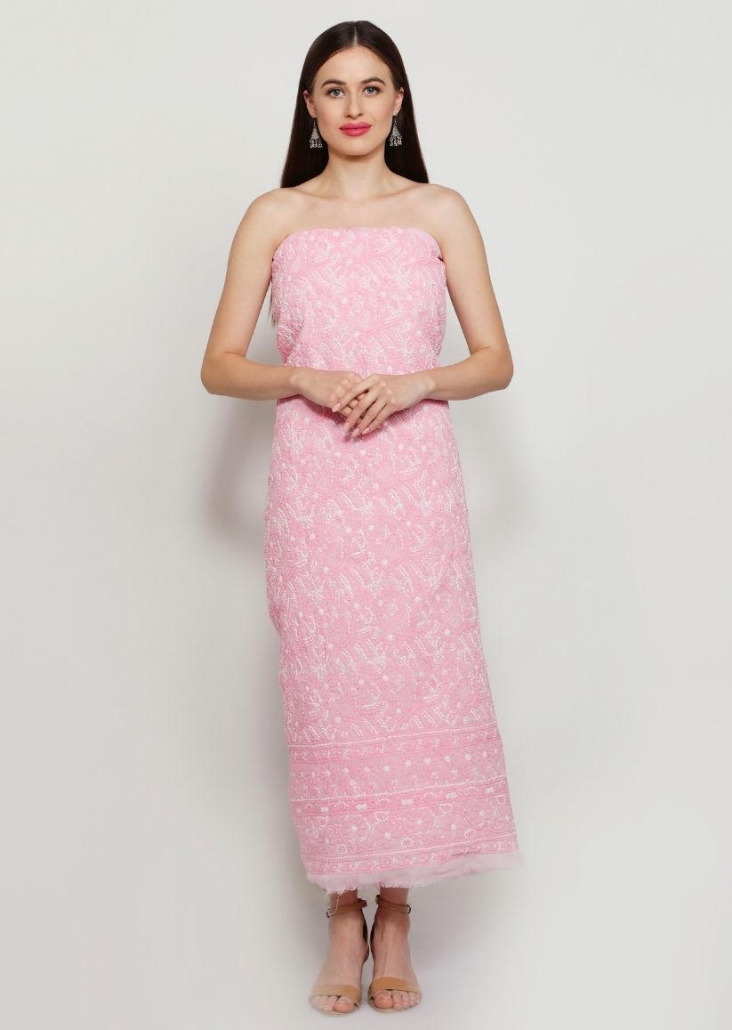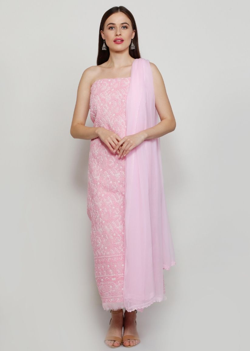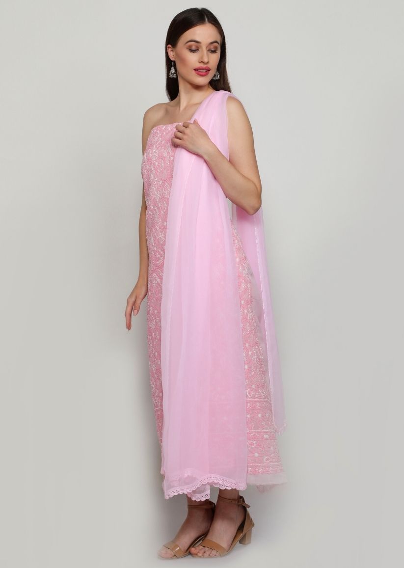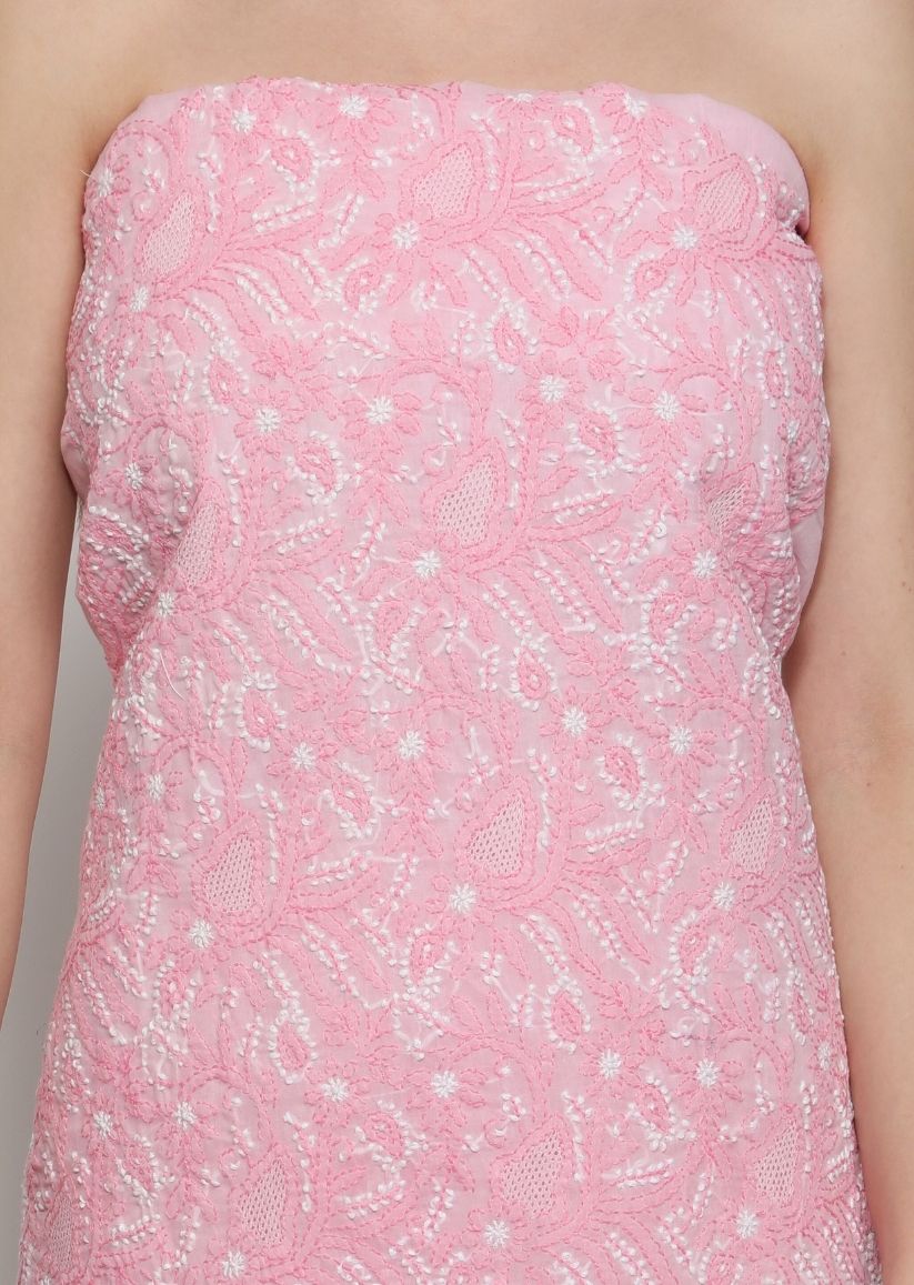 A classic bestseller, this pink unstitched suit set celebrates the finesse of Lucknowi Chikankari. Crafted on soft voile cotton, the kurta features intricate full jaal embroidery in the front, a statement buta at the back, and scattered butis all over. The embroidery showcases a combination of rare jaali stitch, delicate bakhiya, and fine phanda work, executed in white and pink cotton threads for a graceful tonal effect.